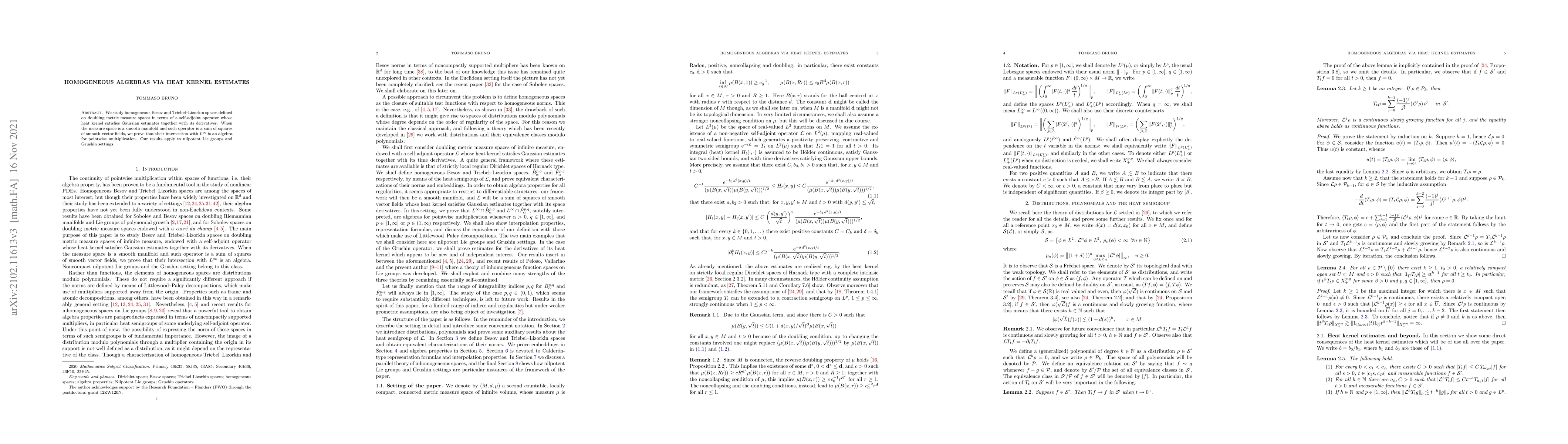 We study homogeneous Besov and Triebel--Lizorkin spaces defined on doubling metric measure spaces in terms of a self-adjoint operator whose heat kernel satisfies Gaussian estimates together with its derivatives. When the measure space is a smooth manifold and such operator is a sum of squares of smooth vector fields, we prove that their intersection with $L^\infty$ is an algebra for pointwise multiplication. Our results apply to nilpotent Lie groups and Grushin settings.
