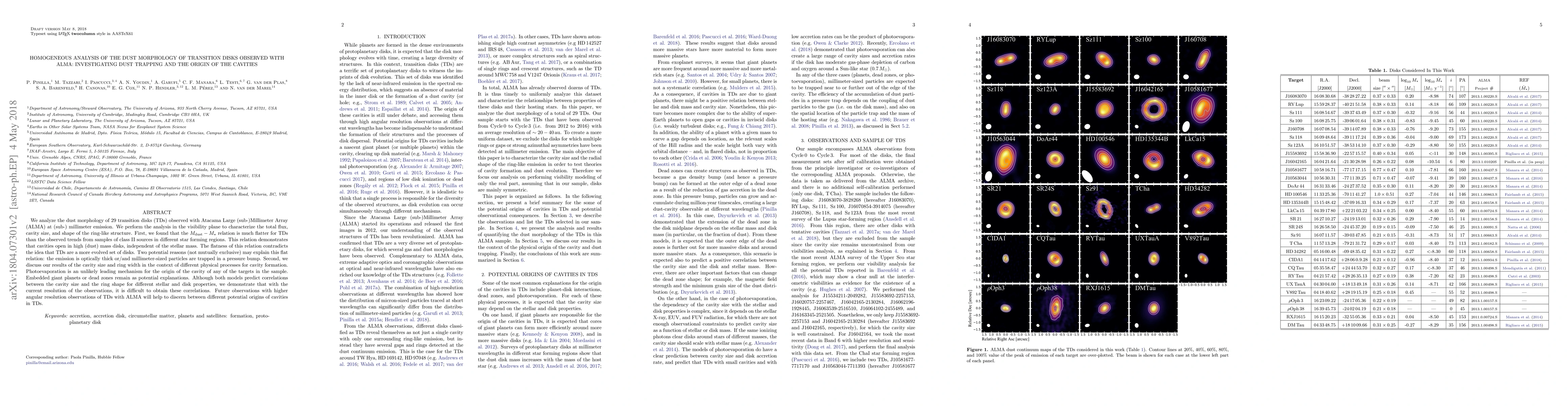 We analyze the dust morphology of 29 transition disks (TDs) observed with ALMA at (sub-) millimeter-emission. We perform the analysis in the visibility plane to characterize the total flux, cavity size, and shape of the ring-like structure. First, we found that the $M_{\rm{dust}}-M_\star$ relation is much flatter for TDs than the observed trends from samples of class II sources in different star forming regions. This relation demonstrates that cavities open in high (dust) mass disks, independent of the stellar mass. The flatness of this relation contradicts the idea that TDs are a more evolved set of disks. Two potential reasons (not mutually exclusive) may explain this flat relation: the emission is optically thick or/and millimeter-sized particles are trapped in a pressure bump. Second, we discuss our results of the cavity size and ring width in the context of different physical processes for cavity formation. Photoevaporation is an unlikely leading mechanism for the origin of the cavity of any of the targets in the sample. Embedded giant planets or dead zones remain as potential explanations. Although both models predict correlations between the cavity size and the ring shape for different stellar and disk properties, we demonstrate that with the current resolution of the observations, it is difficult to obtain these correlations. Future observations with higher angular resolution observations of TDs with ALMA will help to discern between different potential origins of cavities in TDs.