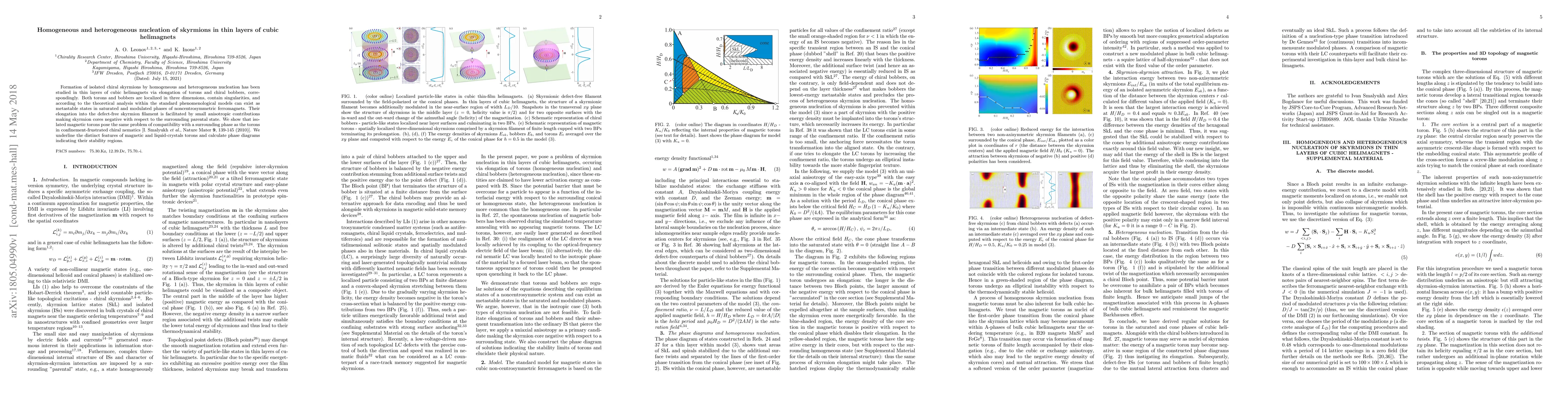 This paper investigates the formation of chiral skyrmions through homogeneous and heterogeneous nucleation in thin cubic helimagnet layers, focusing on the elongation of torons and bobbers. The study reveals distinct stability regions for magnetic and liquid-crystal torons, highlighting their compatibility issues and providing phase diagrams for their existence.