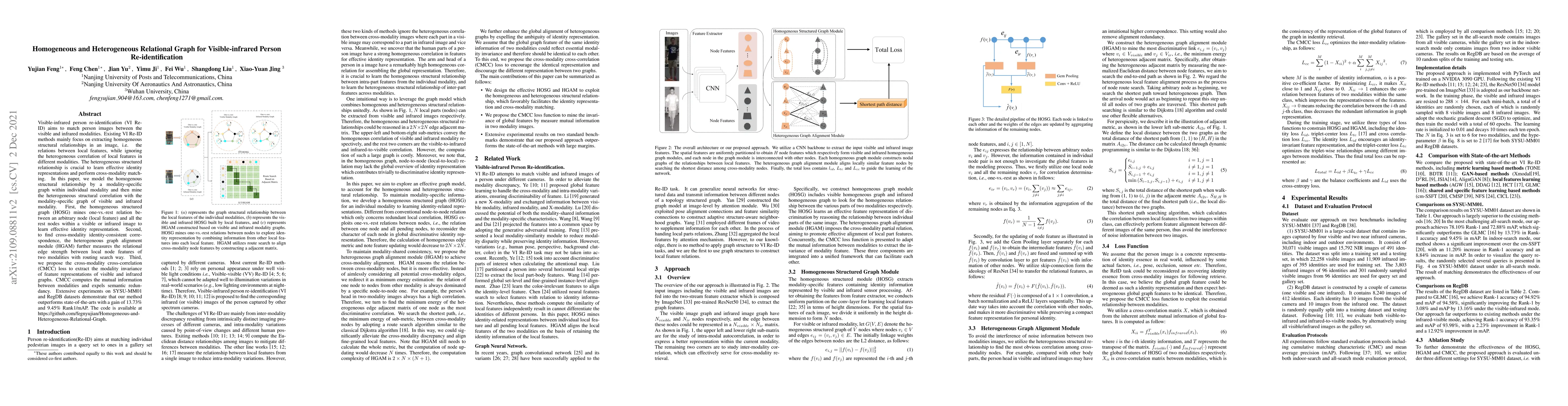 This paper proposes a method to improve visible-infrared person re-identification by modeling both homogeneous and heterogeneous relational graphs. It uses a homogeneous structured graph (HOSG) to learn identity representations within each modality and a heterogeneous graph alignment module (HGAM) to find cross-modality correspondences, complemented by a cross-modality cross-correlation (CMCC) loss to enhance modality invariance. Experimental results show significant improvements over existing methods.