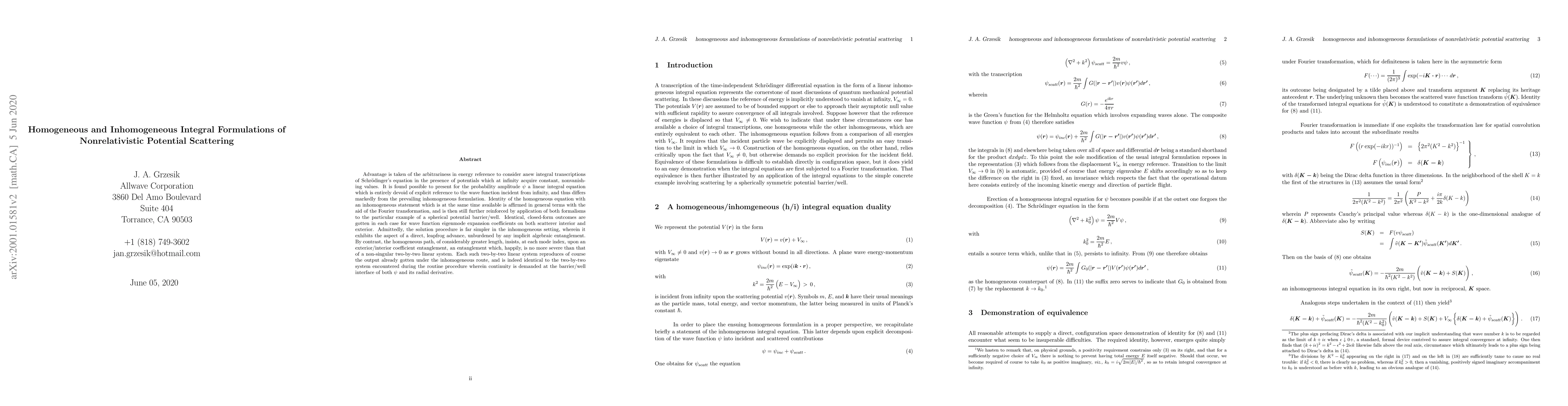 Advantage is taken of the arbitrariness in energy reference to consider anew integral transcriptions of Schrodinger's equation in the presence of potentials which at infinity acquire constant, nonvanishing values. It is found possible to present for the probability amplitude $\psi$ a linear integral equation which is entirely devoid of explicit reference to the wave function incident from infinity, and thus differs markedly from the prevailing inhomogeneous formulation. Identity of the homogeneous equation with an inhomogeneous statement which is at the same time available is affirmed in general terms with the aid of the Fourier transformation, and is then still further reinforced by application of both formalisms to the particular example of a spherical potential barrier/well. Identical, closed-form outcomes are gotten in each case for wave function eigenmode expansion coefficients on both scatterer interior and exterior. Admittedly, the solution procedure is far simpler in the inhomogeneous setting, wherein it exhibits the aspect of a direct, leapfrog advance, unburdened by any implicit algebraic entanglement. By contrast, the homogeneous path, of considerably greater length, insists, at each mode index, upon an exterior/interior coefficient entanglement, an entanglement which, happily, is no more severe than that of a non-singular two-by-two linear system. Each such two-by-two linear system reproduces of course the output already gotten under the inhomogeneous route, and is indeed identical to the two-by-two system encountered during the routine procedure wherein continuity is demanded at the barrier/well interface of both $\psi$ and its radial derivative.