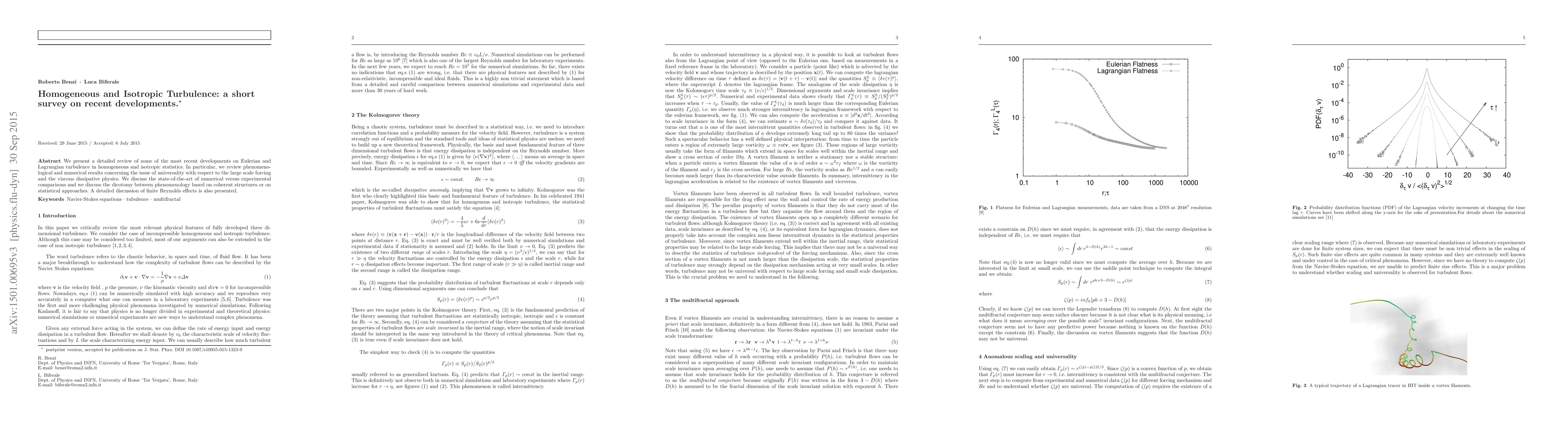 We present a detailed review of some of the most recent developments on Eulerian and Lagrangian turbulence in homogeneous and isotropic statistics. In particular, we review phenomenological and numerical results concerning the issue of universality with respect to the large scale forcing and the viscous dissipative physics. We discuss the state-of-the-art of numerical versus experimental comparisons and we discuss the dicotomy between phenomenology based on coherent structures or on statistical approaches. A detailed discussion of finite Reynolds effects is also presented.