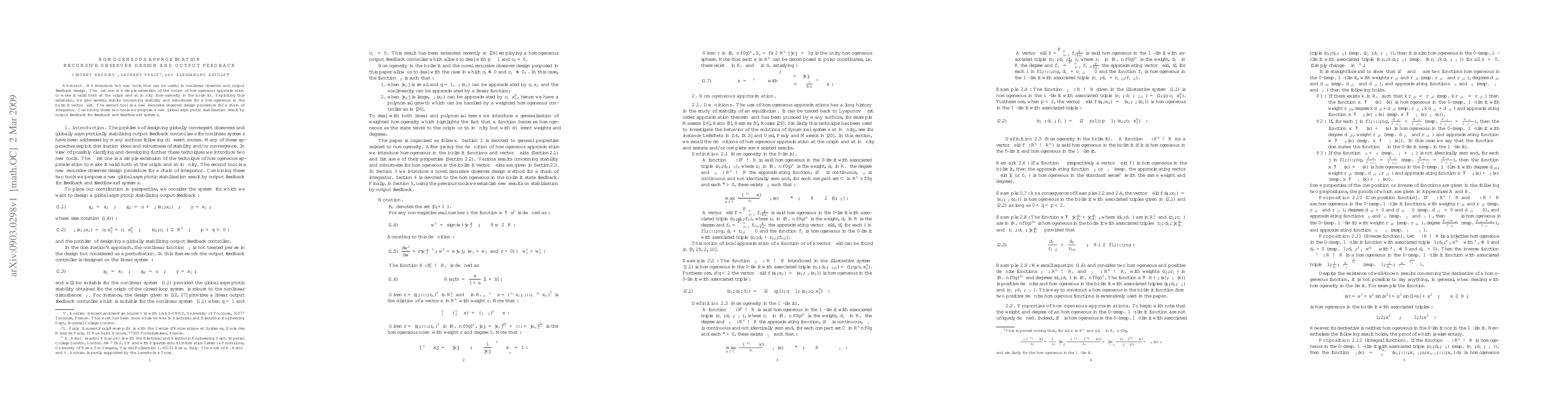 We introduce two new tools that can be useful in nonlinear observer and output feedback design. The first one is a simple extension of the notion of homogeneous approximation to make it valid both at the origin and at infinity (homogeneity in the bi-limit). Exploiting this extension, we give several results concerning stability and robustness for a homogeneous in the bi-limit vector field. The second tool is a new recursive observer design procedure for a chain of integrator. Combining these two tools, we propose a new global asymptotic stabilization result by output feedback for feedback and feedforward systems.