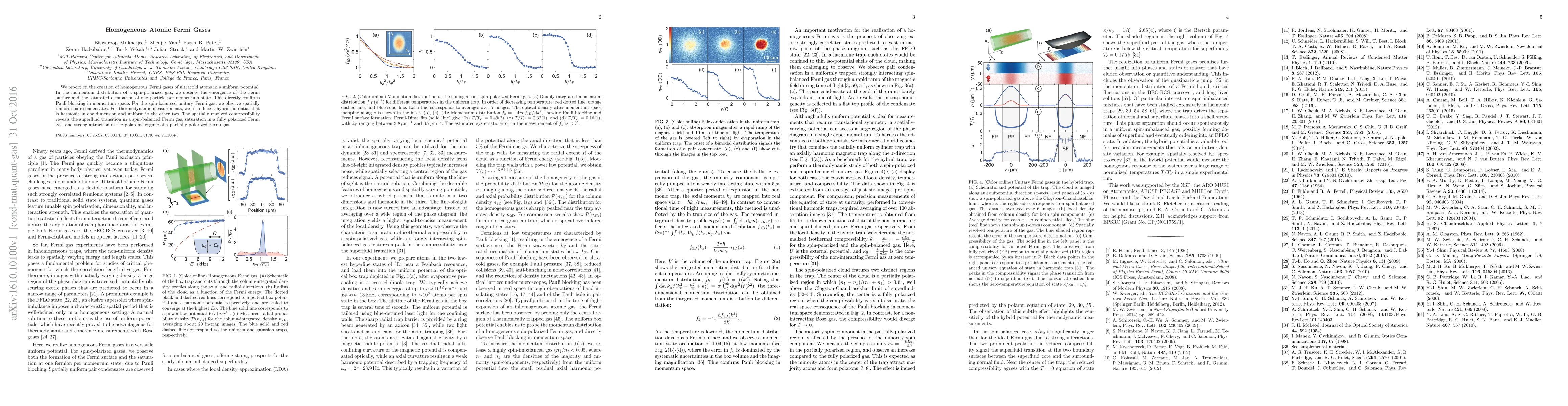 This paper details the creation of homogeneous Fermi gases of ultracold atoms, observing the emergence of the Fermi surface and Pauli blocking in momentum space. It also reports on spatially uniform pair condensates in spin-balanced gases and uses a hybrid potential for thermodynamic measurements to reveal superfluid transitions and strong attraction in various polarization regimes.