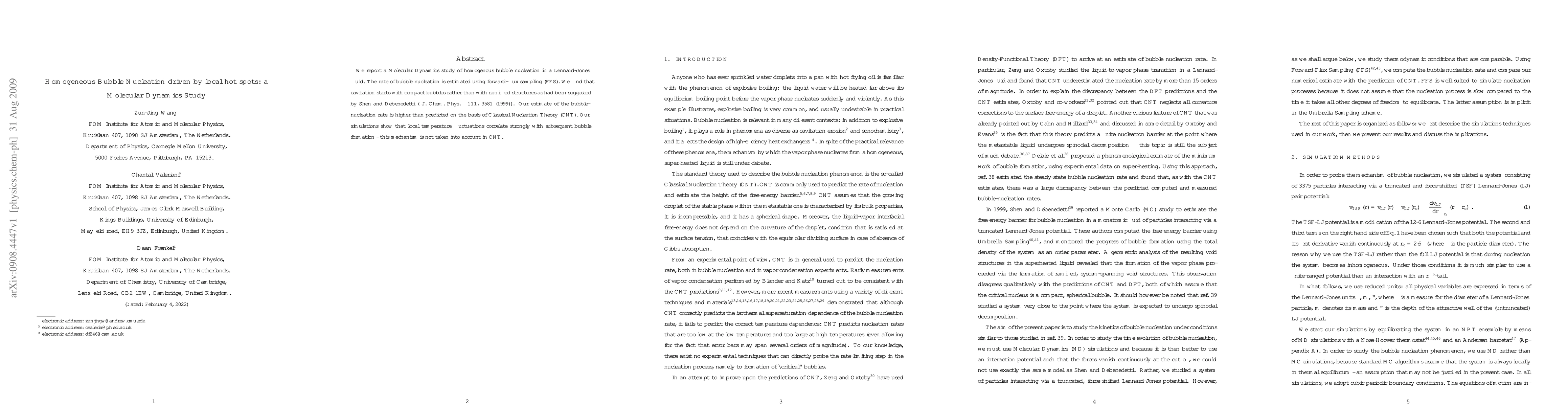 This Molecular Dynamics study investigates homogenous bubble nucleation in a Lennard-Jones fluid, finding that cavitation begins with compact bubbles rather than ramified structures. The study reveals a higher nucleation rate than predicted by Classical Nucleation Theory, attributing the discrepancy to the influence of local temperature fluctuations.