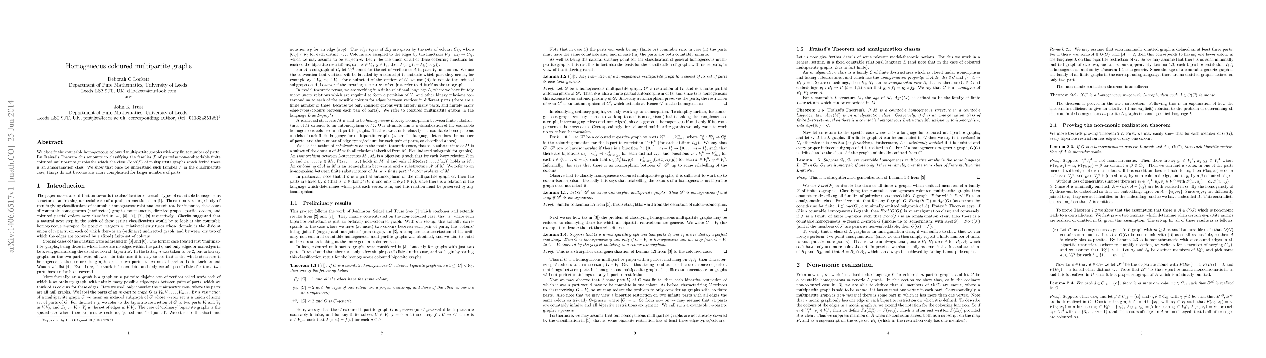 We classify the countable homogeneous coloured multipartite graphs with any finite number of parts. By Fraisse's Theorem this amounts to classifying the families F of pairwise non-embeddable finite coloured multipartite graphs for which the class Forb(F) of multipartite graphs which forbid these is an amalgamation class. We show that once we understand such families F in the quadripartite case, things do not become any more complicated for larger numbers of parts.