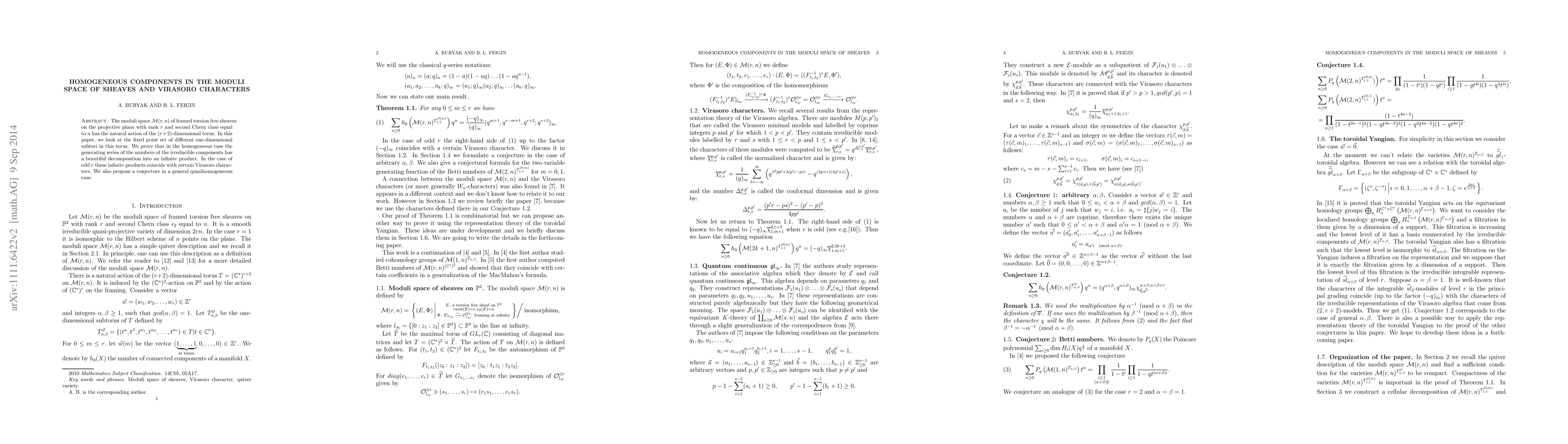 This paper investigates the moduli space of framed torsion-free sheaves on the projective plane, focusing on the fixed point sets under torus actions. It reveals a decomposition of generating series into infinite products that coincide with Virasoro characters for odd rank $r$, proposing a conjecture for the quasihomogeneous case.