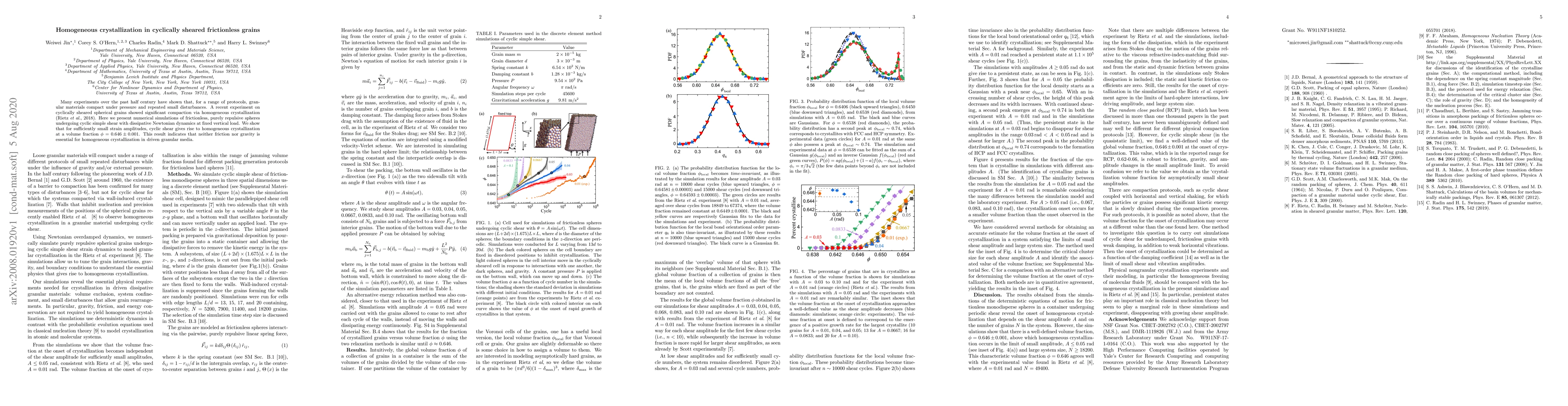 This study uses numerical simulations to demonstrate that frictionless, purely repulsive spheres under cyclic shear can achieve homogeneous crystallization at a volume fraction of 0.646 ± 0.001, indicating that neither friction nor gravity is necessary for this phenomenon in driven granular systems.