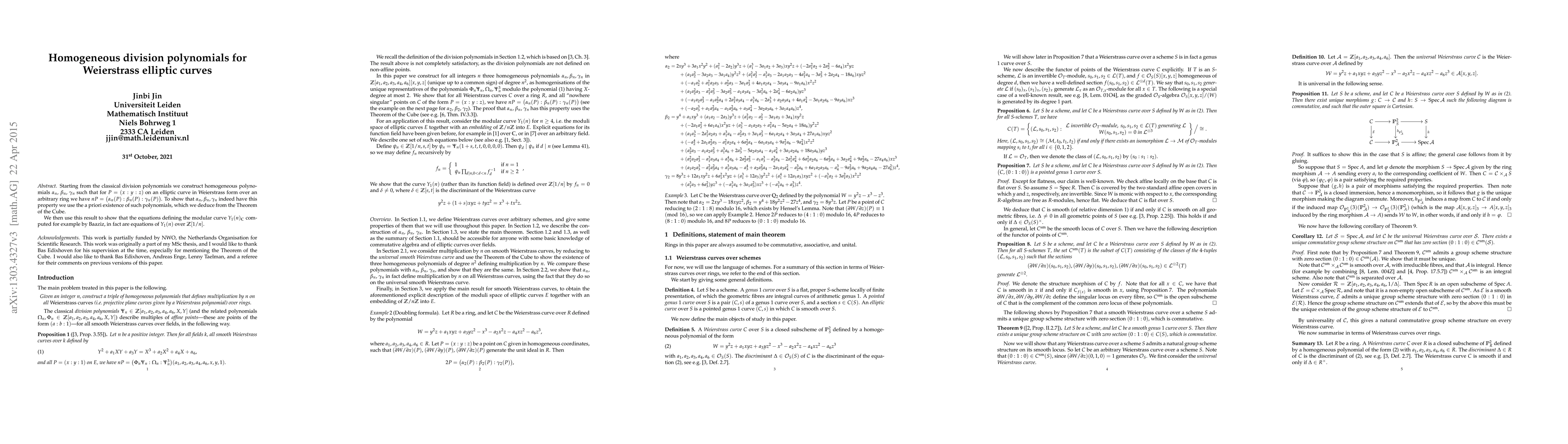 This paper constructs homogeneous division polynomials $\alpha_n$, $\beta_n$, $\gamma_n$ for Weierstrass elliptic curves, showing they represent $nP$ for any point $P$ on the curve. The construction is justified using the Theorem of the Cube, and the result is applied to demonstrate the validity of equations defining the modular curve $Y_1(n)$ over $\mathbb Z[1/n]$.