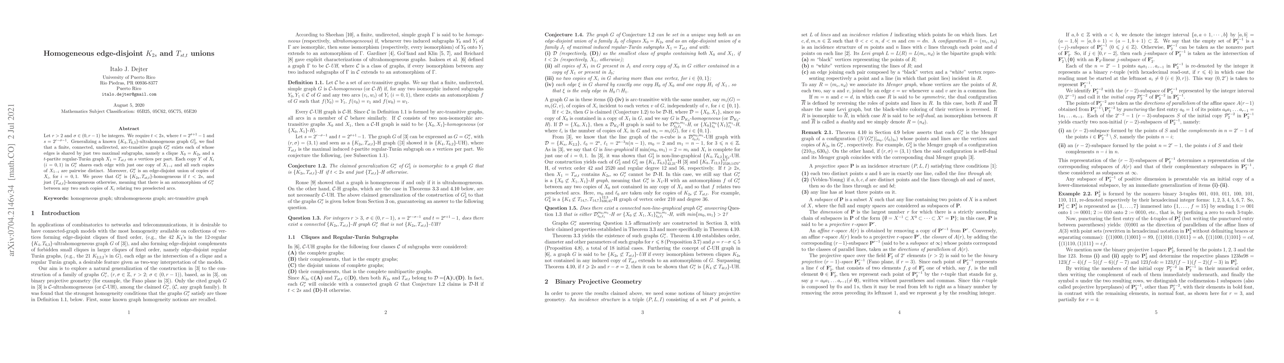 Let $r>2$ and $\sigma\in(0,r-1)$ be integers. We require $t<2s$, where $t=2^{\sigma+1}-1$ and $s=2^{r-\sigma-1}$. Generalizing a known $\{K_4,T_{6,3}\}$-ultrahomogenous graph $G_3^1$, we find that a finite, connected, undirected, arc-transitive graph $G_r^\sigma$ exists each of whose edges is shared by just two maximal subgraphs, namely a clique $X_0=K_{2s}$ and a $t$-partite regular-Tur\'an graph $X_1=T_{st,t}$ on $s$ vertices per part. Each copy $Y$ of $X_i$ ($i=0,1$) in $G_r^\sigma$ shares each edge with just one copy of $X_{1-i}$ and all such copies of $X_{1-i}$ are pairwise distinct. Moreover, $G_r^\sigma$ is an edge-disjoint union of copies of $X_i$, for $i=0,1$. We prove that $G_r^\sigma$ is $\{K_{2s},T_{st,t}\}$-homogeneous if $t<2s$, and just $\{T_{st,t}\}$-homogeneous otherwise, meaning that there is an automorphism of $G_r^\sigma$ between any two such copies of $X_i$ relating two preselected arcs.