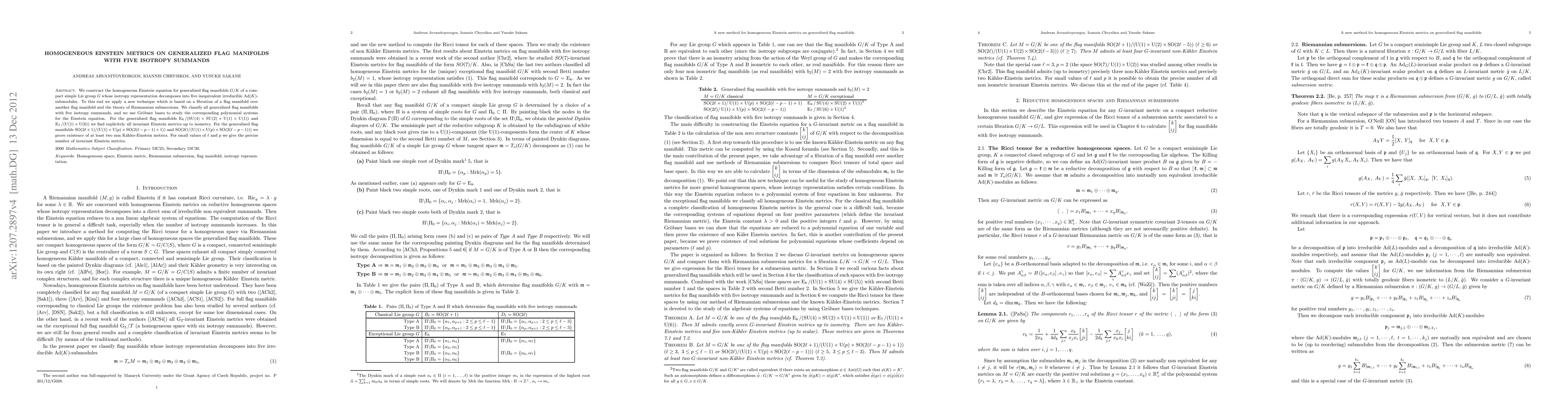 We construct the homogeneous Einstein equation for generalized flag manifolds $G/K$ of a compact simple Lie group $G$ whose isotropy representation decomposes into five inequivalent irreducible $\Ad(K)$-submodules. To this end we apply a new technique which is based on a fibration of a flag manifold over another flag manifold and the theory of Riemannian submersions. We classify all generalized flag manifolds with five isotropy summands, and we use Gr\"obner bases to study the corresponding polynomial systems for the Einstein equation. For the generalized flag manifolds E_6/(SU(4) x SU(2) x U (1) x U (1)) and E_7/(U(1) x U(6)) we find explicitely all invariant Einstein metrics up to isometry. For the generalized flag manifolds SO(2\ell +1)/(U(1) x U (p) x SO(2(\ell -p-1)+1)) and SO(2\ell)/(U(1) x U (p) x SO(2(\ell -p-1))) we prove existence of at least two non K\"ahler-Einstein metrics. For small values of $\ell$ and $p$ we give the precise number of invariant Einstein metrics.