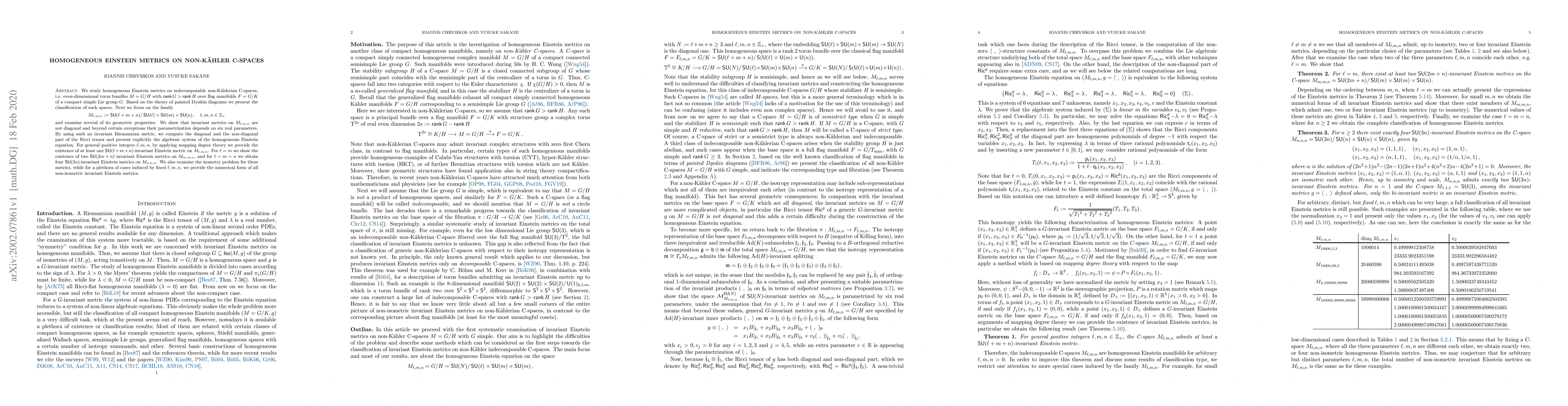 This paper classifies homogeneous Einstein metrics on non-Kählerian C-spaces, specifically focusing on the family of spaces \( M_{\ell, m, n} \). It demonstrates the existence of invariant Einstein metrics under specific conditions and explores their geometric properties and parametrization.