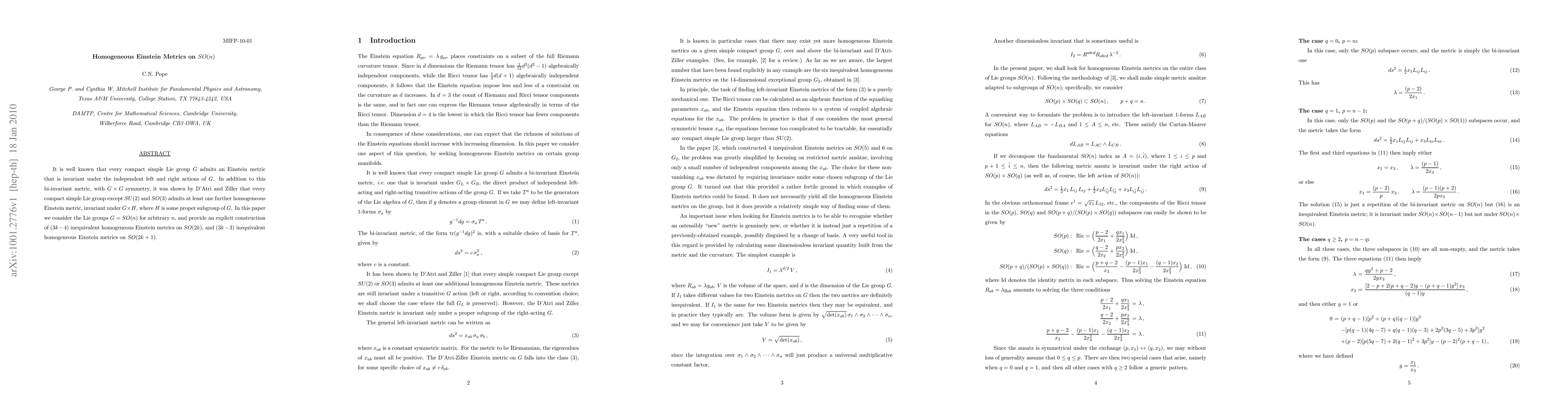 This paper constructs explicit homogeneous Einstein metrics on the special orthogonal groups SO(n) for arbitrary n. It finds (3k-4) inequivalent metrics for SO(2k) and (3k-3) for SO(2k+1), extending previous results for compact simple Lie groups.