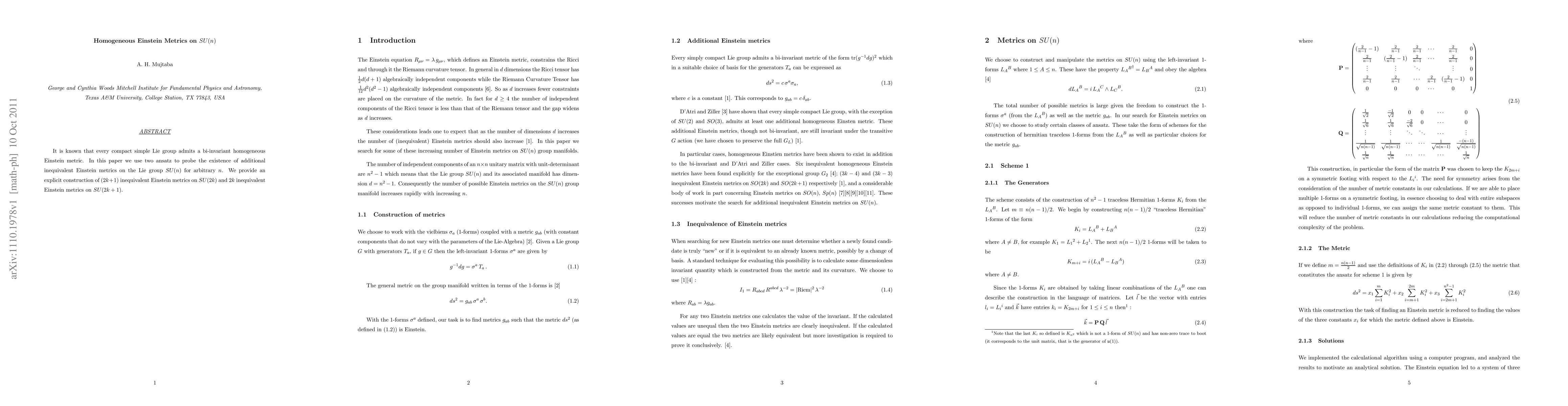 It is known that every compact simple Lie group admits a bi-invariant homogeneous Einstein metric. In this paper we use two ansatz to probe the existence of additional inequivalent Einstein metrics on the Lie group SU (n) for arbitrary n. We provide an explicit construction of (2k+1) inequivalent Einstein metrics on SU (2k) and 2k inequivalent Einstein metrics on SU (2k + 1).