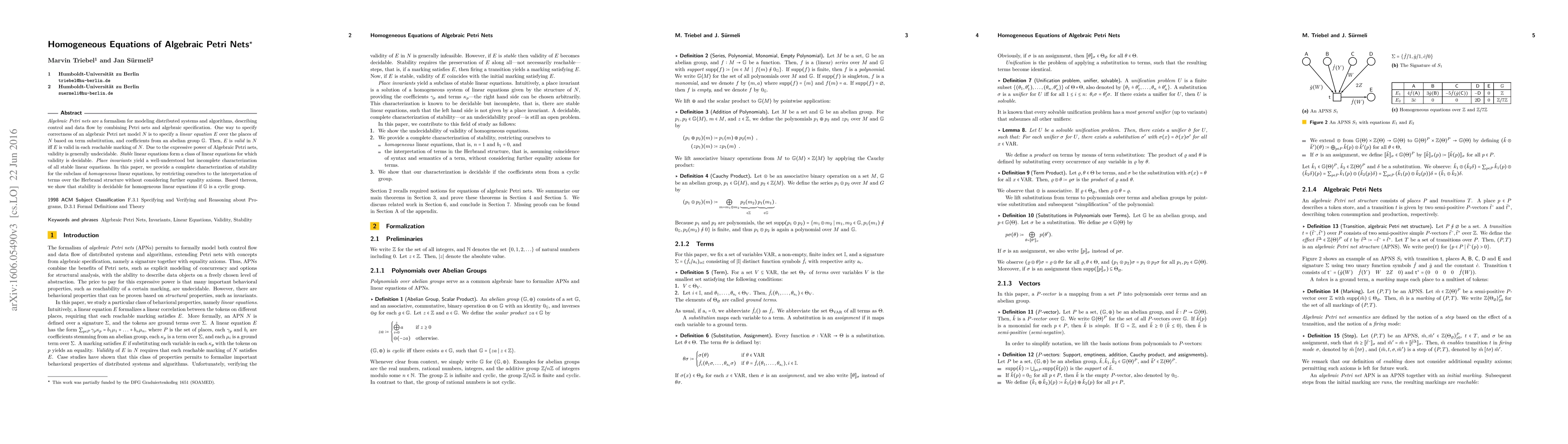 Algebraic Petri nets are a formalism for modeling distributed systems and algorithms, describing control and data flow by combining Petri nets and algebraic specification. One way to specify correctness of an algebraic Petri net model $N$ is to specify a linear equation $E$ over the places of $N$ based on term substitution, and coefficients from an abelian group $G$. Then, $E$ is valid in $N$ iff $E$ is valid in each reachable marking of $N$ . Due to the expressive power of Algebraic Petri nets, validity is generally undecidable. Stable linear equations form a class of linear equations for which validity is decidable. Place invariants yield a well-understood but incomplete characterization of all stable linear equations. In this paper, we provide a complete characterization of stability for the subclass of homogeneous linear equations, by restricting ourselves to the interpretation of terms over the Herbrand structure without considering further equality axioms. Based thereon, we show that stability is decidable for homogeneous linear equations if $G$ is a cyclic group.