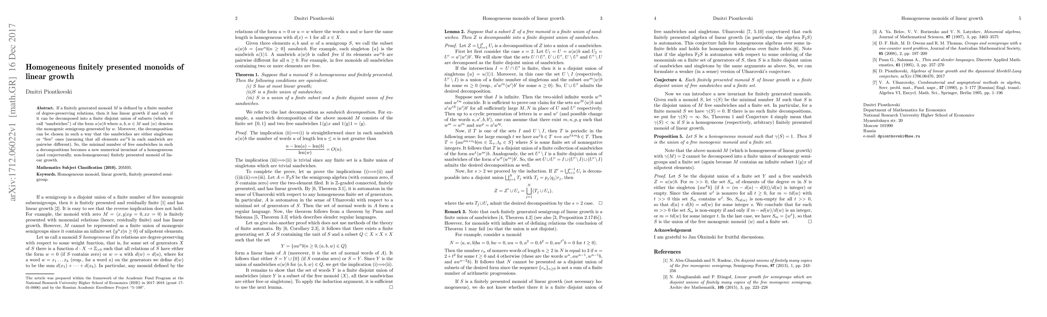 A finitely generated monoid can be decomposed into linear growth sandwiches of specific forms, with a minimal number of free sandwiches serving as a numerical invariant. This decomposition is unique and captures the essence of homogeneous finitely presented monoids of linear growth.