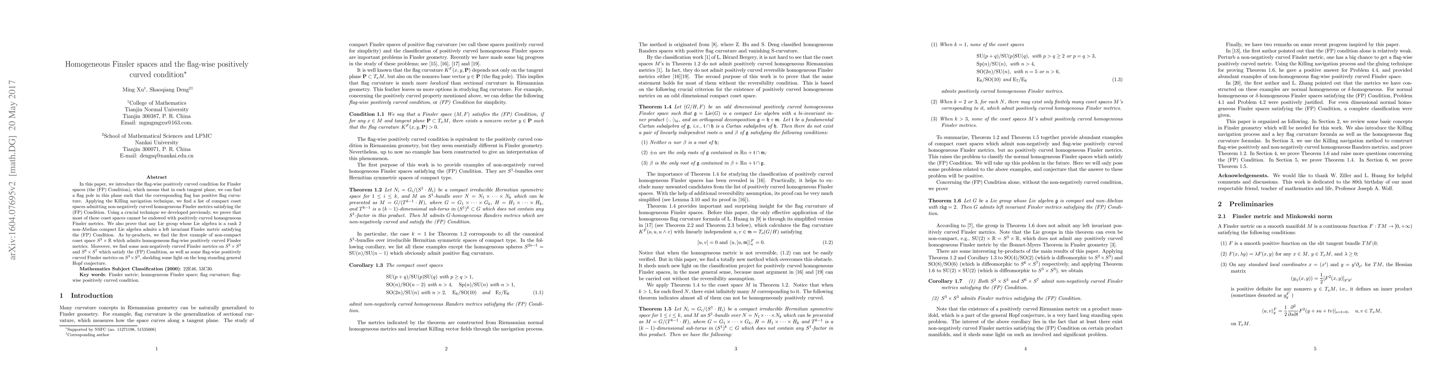 This paper introduces the flag-wise positively curved condition (FP Condition) for Finsler spaces and identifies several compact coset spaces with non-negatively curved homogeneous Finsler metrics satisfying this condition. It proves that most of these coset spaces cannot have positively curved metrics and provides examples of non-compact spaces with such metrics, contributing to the understanding of the general Hopf conjecture.
