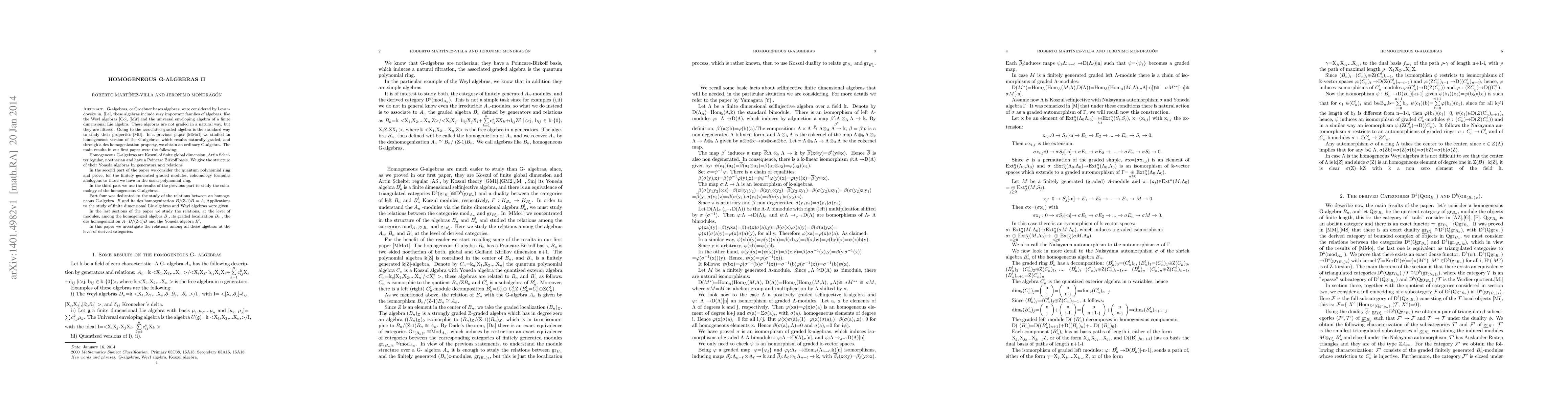 G-algebras, or Groebner bases algebras, were considered by Levandovsky, these algebras include very important families of algebras, like the Weyl algebras and the universal enveloping algebra of a finite dimensional Lie algebra. These algebras are not graded in a natural way, but they are filtered. Going to the associated graded algebra is the standard way to study their properties. In a previous paper we studied an homogeneous version of the G-algebras, which results naturally graded, and through a des homogenization property, we obtain an ordinary G-algebra. The main results in our first paper were the following: Homogeneous G-algebras are Koszul of finite global dimension, Artin Schelter regular, noetherian and have a Poincare Birkoff basis. We give the structure of their Yoneda algebras by generators and relations. In the second part of the paper we consider the quantum polynomial ring and prove, for the finitely generated graded modules, cohomology formulas analogous to those we have in the usual polynomial ring. In the third part we use the results of the previous part to study the cohomology of the homogeneous G-algebras. Part four was dedicated to the study of the relations between an homogeneous G-algebra B and its des homogenization B/(Z-1)B=A, Applications to the study of finite dimensional Lie algebras and Weyl algebras were given. In the last sections of the paper we study the relations, at the level of modules, among the homogenized algebra B, its graded localization B_{z}, the des homogenization A=B/(Z-1)B and the Yoneda algebra B^{!}. In this paper we investigate the relations among all these algebras at the level of derived categories.
