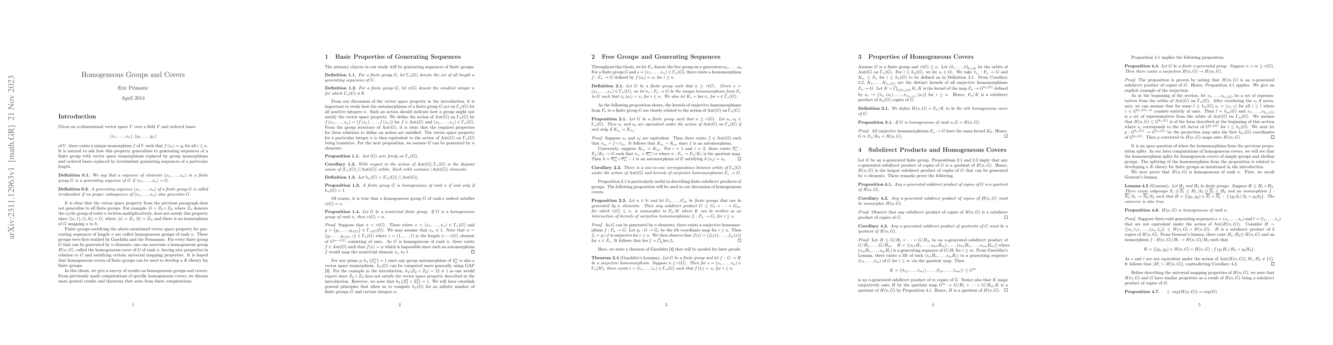 This paper explores homogeneous covers and generating sequences within finite groups, presenting significant results derived from the author's 2014 Cornell Senior Thesis under the supervision of R. Keith Dennis. The study contributes to the understanding of group structures and their covers.