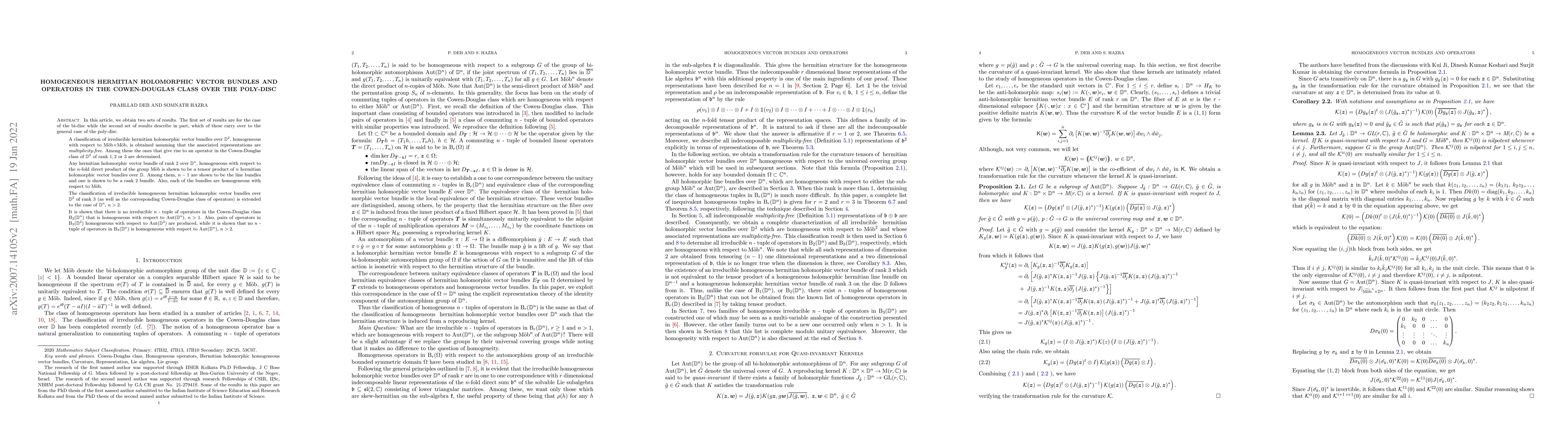 In this article, we obtain two sets of results. The first set of complete results are exclusively for the case of the bi-disc while the second set of results describe in part, which of these carry over to the general case of the poly-disc: * A classification of irreducible hermitian holomorphic vector bundles over $\mathbb{D}^2$, homogeneous with respect to $\mbox{M\"ob}\times \mbox{M\"ob}$, is obtained assuming that the associated representations are \textit{multiplicity-free}. Among these the ones that give rise to an operator in the Cowen-Douglas class of $\mathbb{D}^2$ of rank $1,2$ or $3$ is determined. * Any hermitian holomorphic vector bundle of rank $2$ over $\mathbb{D}^n$, homogeneous with respect to the $n$-fold product of the group $\mbox{M\"ob}$ is shown to be a tensor product of $n-1$ hermitian holomorphic line bundles, each of which is homogeneous with respect to $\mbox{M\"ob}$ and a hermitian holomorphic vector bundle of rank $2$, homogeneous with respect to $\mbox{M\"ob}$. * The classification of irreducible homogeneous hermitian holomorphic vector buldles over $\mathbb{D}^2$ of rank $3$ (as well as the corresponding Cowen-Douglas class of operators) is extended to the case of $\mathbb{D}^n$, $n>2$. * It is shown that there is no irreducible $n$ - tuple of operators in the Cowen-Douglas class $\mathrm B_2(\mathbb{D}^n)$ that is homogeneous with respect $\mbox{Aut}(\mathbb{D}^n)$, $n >1$. Also, pairs of operators in $\mathrm B_3(\mathbb{D}^2)$ homogeneous with respect to $\mbox{Aut}(\mathbb{D}^2)$ are produced, while it is shown that no $n$ - tuple of operators in $\mathrm B_3(\mathbb{D}^n)$ is homogeneous with respect to $\mbox{Aut}(\mathbb{D}^n)$, $n > 2$.