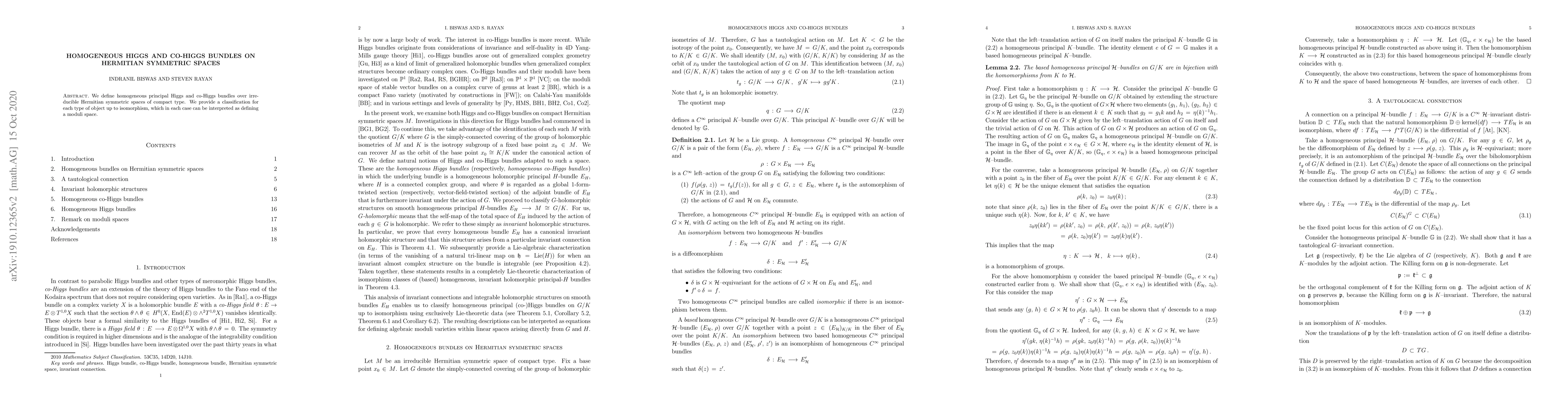 This paper introduces and classifies homogeneous principal Higgs and co-Higgs bundles on irreducible Hermitian symmetric spaces of compact type, establishing moduli spaces for each type of bundle.