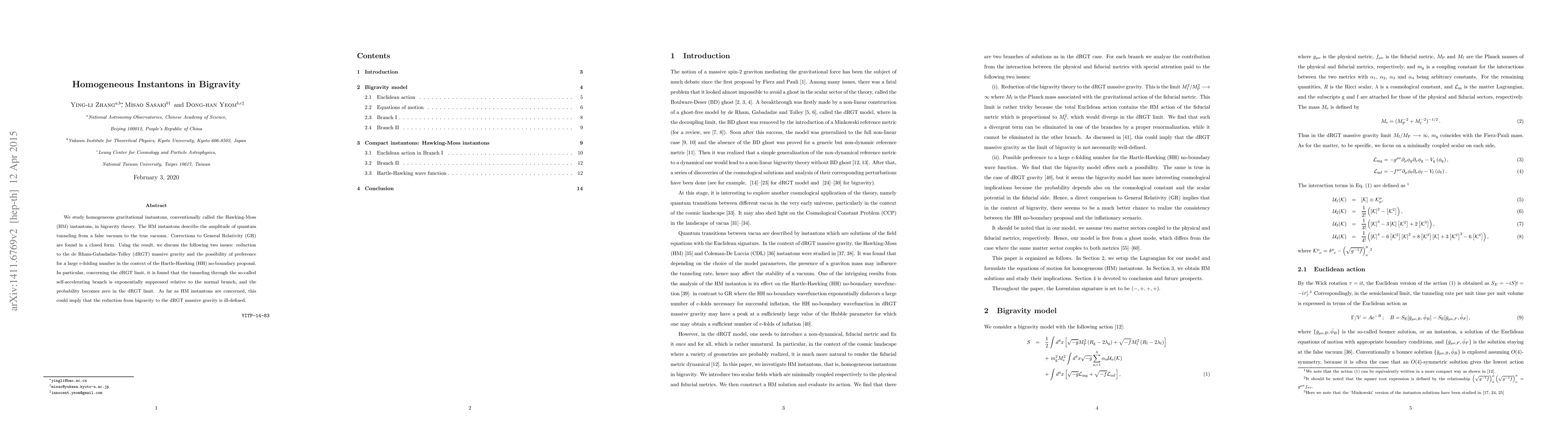 This paper investigates homogeneous gravitational instantons in bigravity theory, finding corrections to General Relativity in closed form. It discusses the implications for the dRGT massive gravity limit and the Hartle-Hawking no-boundary proposal, revealing that tunneling through the self-accelerating branch is exponentially suppressed, suggesting the reduction from bigravity to dRGT massive gravity may be ill-defined.