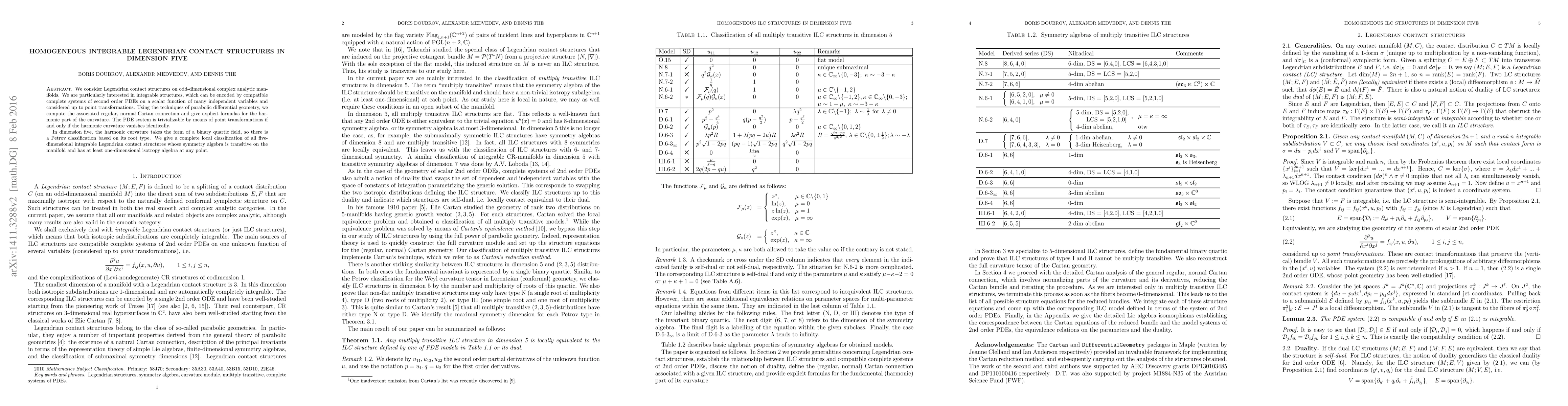 We consider Legendrian contact structures on odd-dimensional complex analytic manifolds. We are particularly interested in integrable structures, which can be encoded by compatible complete systems of second order PDEs on a scalar function of many independent variables and considered up to point transformations. Using the techniques of parabolic differential geometry, we compute the associated regular, normal Cartan connection and give explicit formulas for the harmonic part of the curvature. The PDE system is trivializable by means of point transformations if and only if the harmonic curvature vanishes identically. In dimension five, the harmonic curvature takes the form of a binary quartic field, so there is a Petrov classification based on its root type. We give a complete local classification of all five-dimensional integrable Legendrian contact structures whose symmetry algebra is transitive on the manifold and has at least one-dimensional isotropy algebra at any point.
