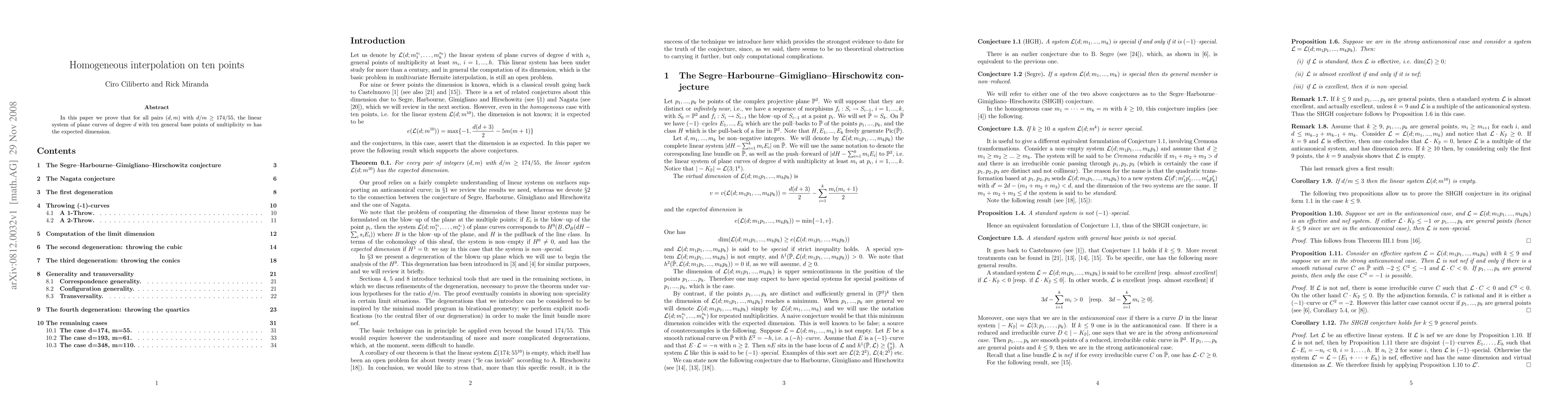 This paper proves that for pairs (d,m) with d/m ≥ 174/55, linear systems of plane curves of degree d with ten general base points of multiplicity m have the expected dimension, ensuring homogeneous interpolation stability under these conditions.