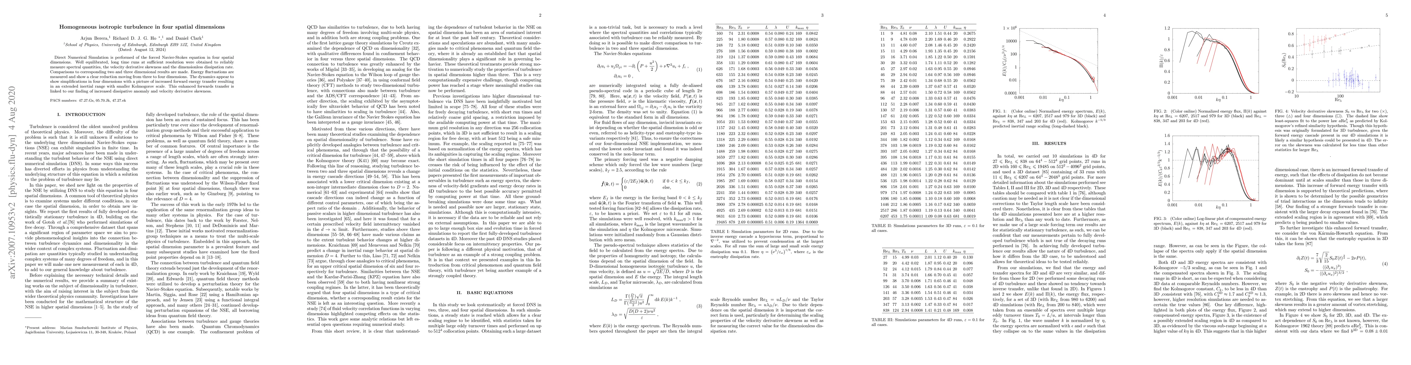 Direct Numerical Simulation (DNS) of the forced Navier-Stokes equation in four spatial dimensions, comparing results with two and three dimensions.
