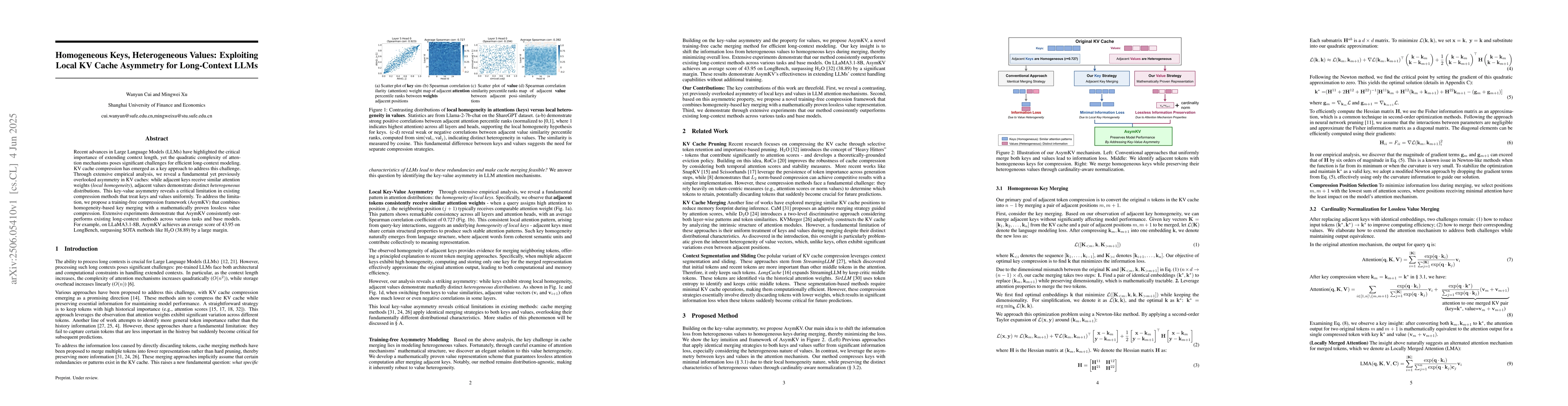 Recent advances in Large Language Models (LLMs) have highlighted the critical importance of extending context length, yet the quadratic complexity of attention mechanisms poses significant challenges for efficient long-context modeling. KV cache compression has emerged as a key approach to address this challenge. Through extensive empirical analysis, we reveal a fundamental yet previously overlooked asymmetry in KV caches: while adjacent keys receive similar attention weights (local homogeneity), adjacent values demonstrate distinct heterogeneous distributions. This key-value asymmetry reveals a critical limitation in existing compression methods that treat keys and values uniformly. To address the limitation, we propose a training-free compression framework (AsymKV) that combines homogeneity-based key merging with a mathematically proven lossless value compression. Extensive experiments demonstrate that AsymKV consistently outperforms existing long-context methods across various tasks and base models. For example, on LLaMA3.1-8B, AsymKV achieves an average score of 43.95 on LongBench, surpassing SOTA methods like H$_2$O (38.89) by a large margin.