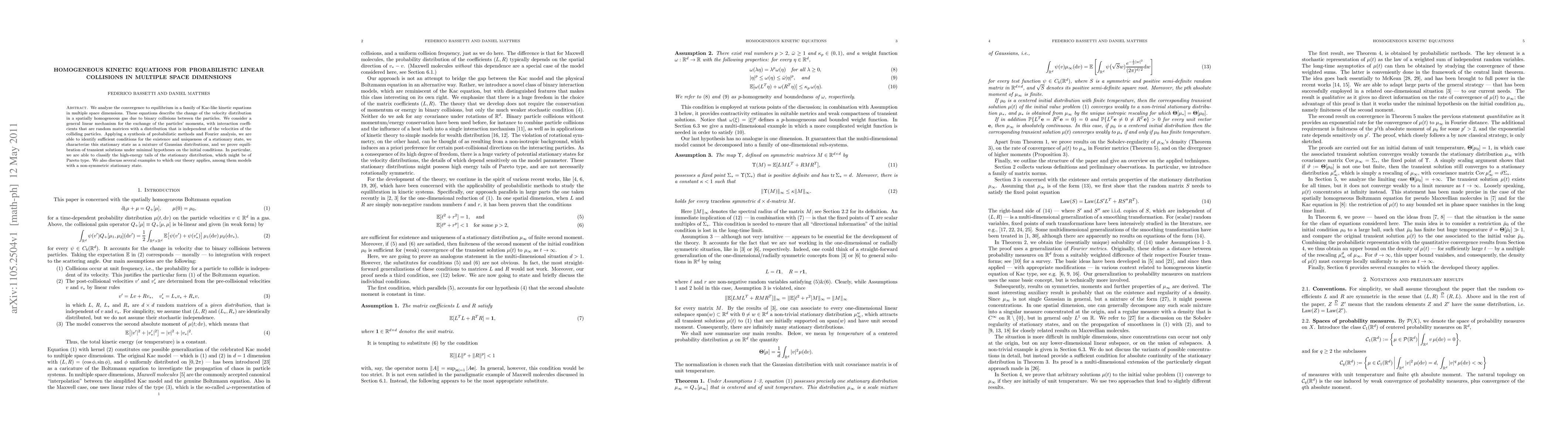 We analyze the convergence to equilibrium in a family of Kac-like kinetic equations in multiple space dimensions. These equations describe the change of the velocity distribution in a spatially homogeneous gas due to binary collisions between the particles. We consider a general linear mechanism for the exchange of the particles' momenta, with interaction coefficients that are random matrices with a distribution that is {independent} of the velocities of the colliding particles. Applying a synthesis of probabilistic methods and Fourier analysis, we are able to identify sufficient conditions for the existence and uniqueness of a stationary state, we characterize this stationary state as a mixture of Gaussian distributions, and we prove equilibration of transient solutions under minimal hypotheses on the initial conditions. In particular, we are able to classify the high-energy tails of the stationary distribution, which might be of Pareto type. We also discuss several examples to which our theory applies, among them models with a non-symmetric stationary state.