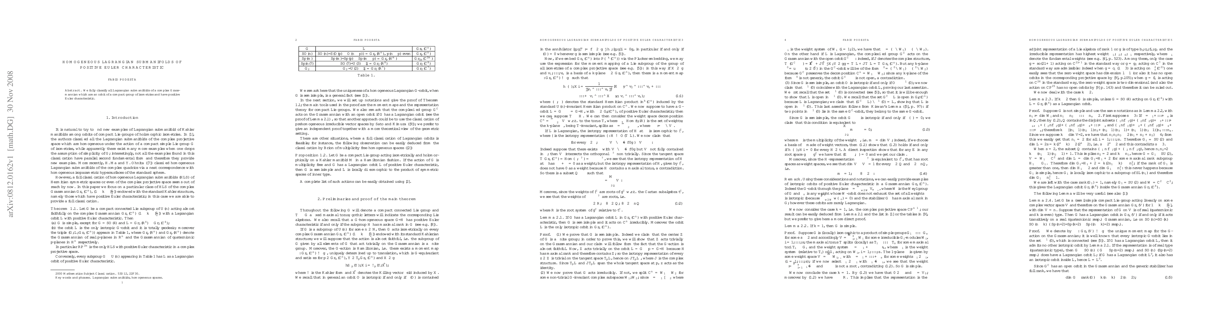This paper classifies all Lagrangian submanifolds in a complex Grassmannian that are invariant under a compact group of isometries and possess a positive Euler characteristic. The study provides a comprehensive understanding of such homogeneous Lagrangian submanifolds.
