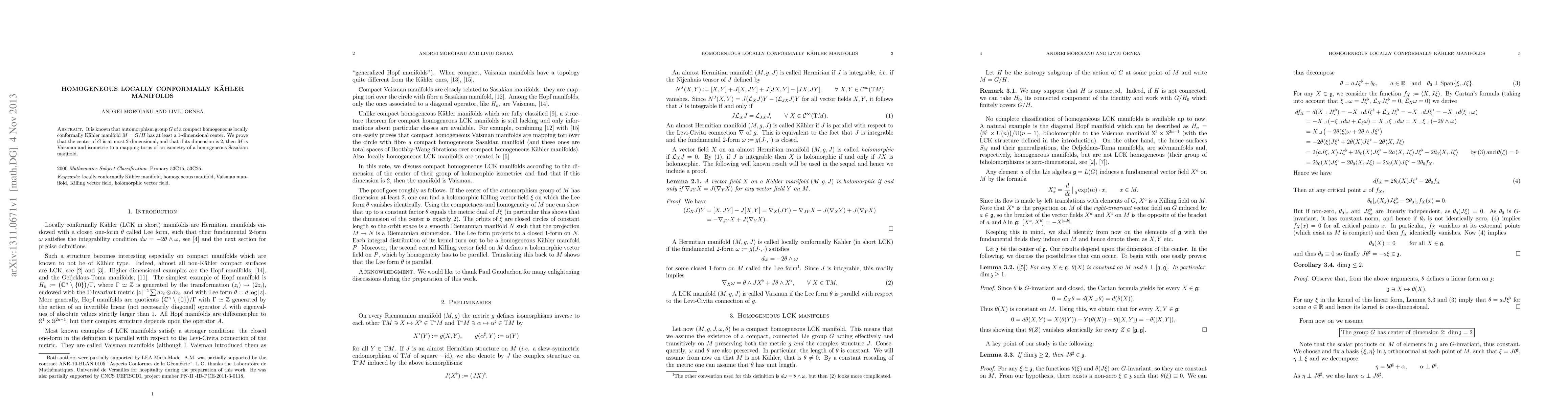 The research investigates homogeneous locally conformally Kähler (LCK) manifolds, focusing on the automorphism group G and its center, utilizing Lie algebra techniques and Killing vector fields.