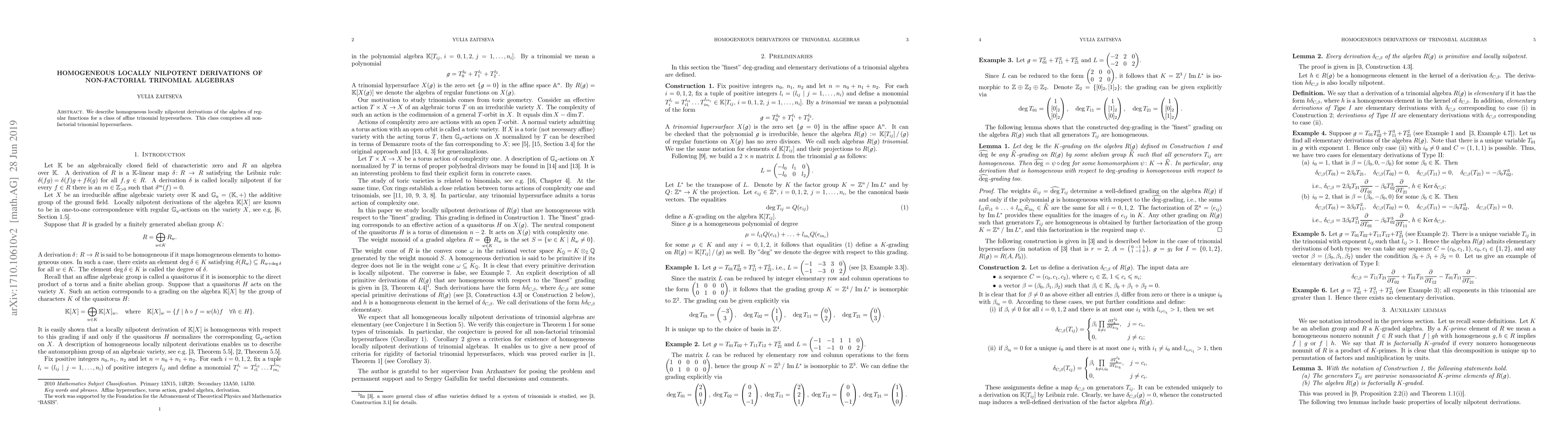 Summary: This paper explores homogeneous locally nilpotent derivations in the algebra of regular functions for non-factorial trinomial affine hypersurfaces, providing a detailed description of these derivations. The focus is on a specific class of trinomial algebras that do not factorize.