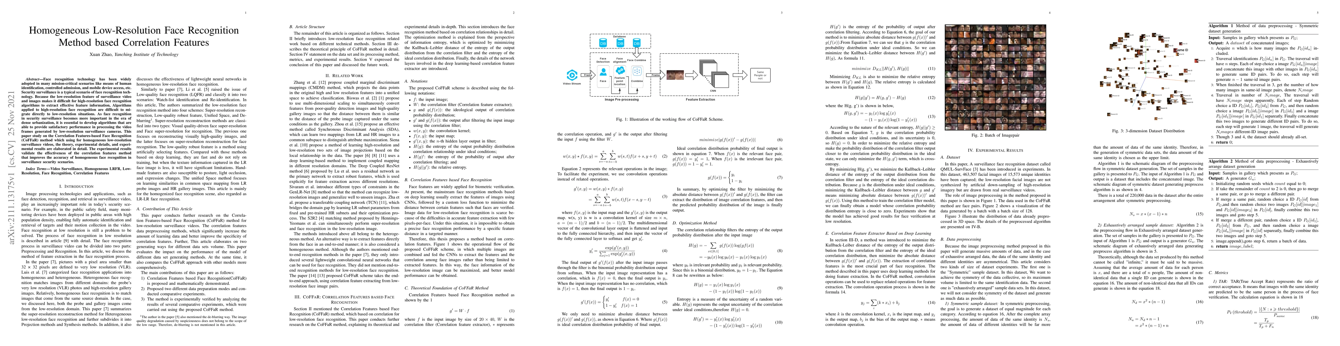 Face recognition technology has been widely adopted in many mission-critical scenarios like means of human identification, controlled admission, and mobile device access, etc. Security surveillance is a typical scenario of face recognition technology. Because the low-resolution feature of surveillance video and images makes it difficult for high-resolution face recognition algorithms to extract effective feature information, Algorithms applied to high-resolution face recognition are difficult to migrate directly to low-resolution situations. As face recognition in security surveillance becomes more important in the era of dense urbanization, it is essential to develop algorithms that are able to provide satisfactory performance in processing the video frames generated by low-resolution surveillance cameras. This paper study on the Correlation Features-based Face Recognition (CoFFaR) method which using for homogeneous low-resolution surveillance videos, the theory, experimental details, and experimental results are elaborated in detail. The experimental results validate the effectiveness of the correlation features method that improves the accuracy of homogeneous face recognition in surveillance security scenarios.