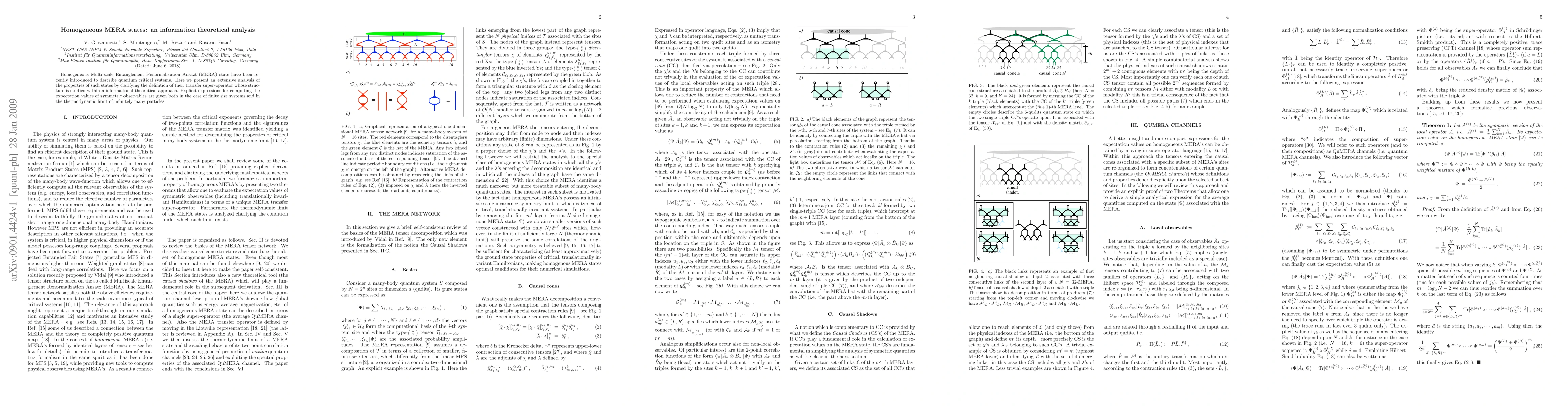 Homogeneous Multi-scale Entanglement Renormalization Ansazt (MERA) state have been recently introduced to describe quantum critical systems. Here we present an extensive analysis of the properties of such states by clarifying the definition of their transfer super-operator whose structure is studied within a informational theoretical approach. Explicit expressions for computing the expectation values of symmetric observables are given both in the case of finite size systems and in the thermodynamic limit of infinitely many particles.