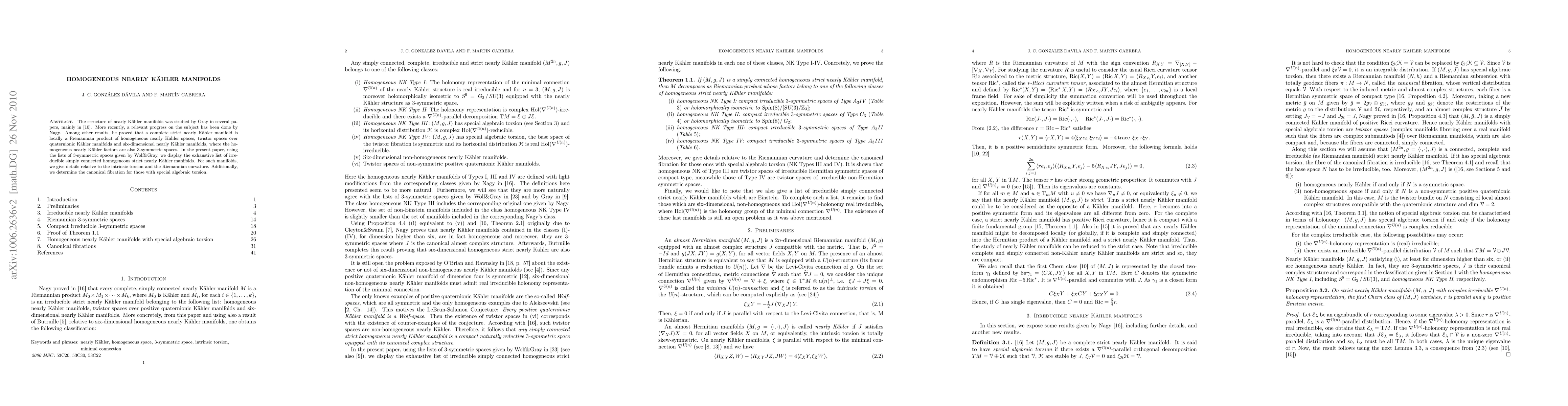 The structure of nearly K\"ahler manifolds was studied by Gray in several papers. More recently, a relevant progress on the subject has been done by Nagy. Among other results, he proved that a strict and complete nearly K\"ahler manifold is locally a Riemannian product of homogeneous nearly K\"ahler spaces, twistor spaces over quaternionic K{\"ahler manifolds and six-dimensional nearly K\"ahler manifolds, where the homogeneous nearly K\"ahler factors are also 3-symmetric spaces. In the present paper, using the lists of $3$-symmetric spaces given by Wolf & Gray, we display the exhaustive list of irreducible simply connected homogeneous strict nearly K\"ahler manifolds. For such manifolds, we give details relative to the intrinsic torsion and the Riemannian curvature. Additionally, we determine the canonical fibration for those with special algebraic torsion.