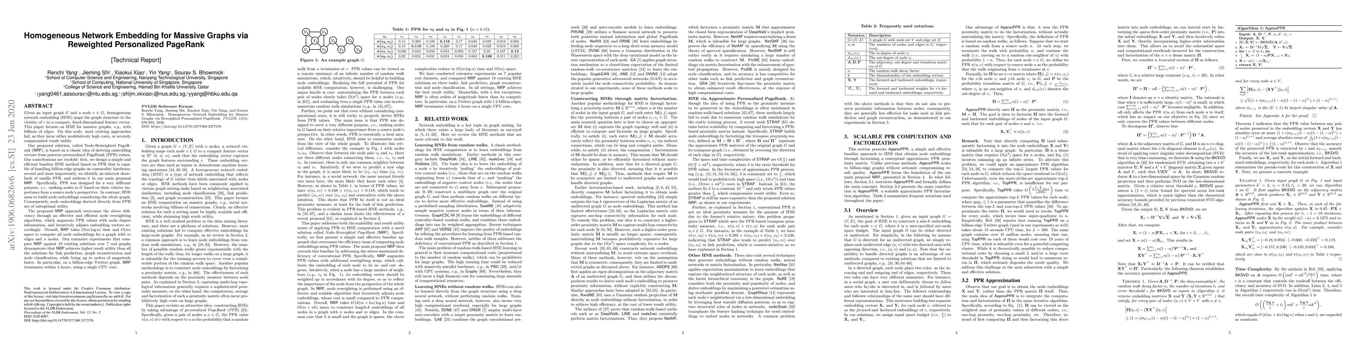 Given an input graph G and a node v in G, homogeneous network embedding (HNE) maps the graph structure in the vicinity of v to a compact, fixed-dimensional feature vector. This paper focuses on HNE for massive graphs, e.g., with billions of edges. On this scale, most existing approaches fail, as they incur either prohibitively high costs, or severely compromised result utility. Our proposed solution, called Node-Reweighted PageRank (NRP), is based on a classic idea of deriving embedding vectors from pairwise personalized PageRank (PPR) values. Our contributions are twofold: first, we design a simple and efficient baseline HNE method based on PPR that is capable of handling billion-edge graphs on commodity hardware; second and more importantly, we identify an inherent drawback of vanilla PPR, and address it in our main proposal NRP. Specifically, PPR was designed for a very different purpose, i.e., ranking nodes in G based on their relative importance from a source node's perspective. In contrast, HNE aims to build node embeddings considering the whole graph. Consequently, node embeddings derived directly from PPR are of suboptimal utility. The proposed NRP approach overcomes the above deficiency through an effective and efficient node reweighting algorithm, which augments PPR values with node degree information, and iteratively adjusts embedding vectors accordingly. Overall, NRP takes O(mlogn) time and O(m) space to compute all node embeddings for a graph with m edges and n nodes. Our extensive experiments that compare NRP against 18 existing solutions over 7 real graphs demonstrate that NRP achieves higher result utility than all the solutions for link prediction, graph reconstruction and node classification, while being up to orders of magnitude faster. In particular, on a billion-edge Twitter graph, NRP terminates within 4 hours, using a single CPU core.