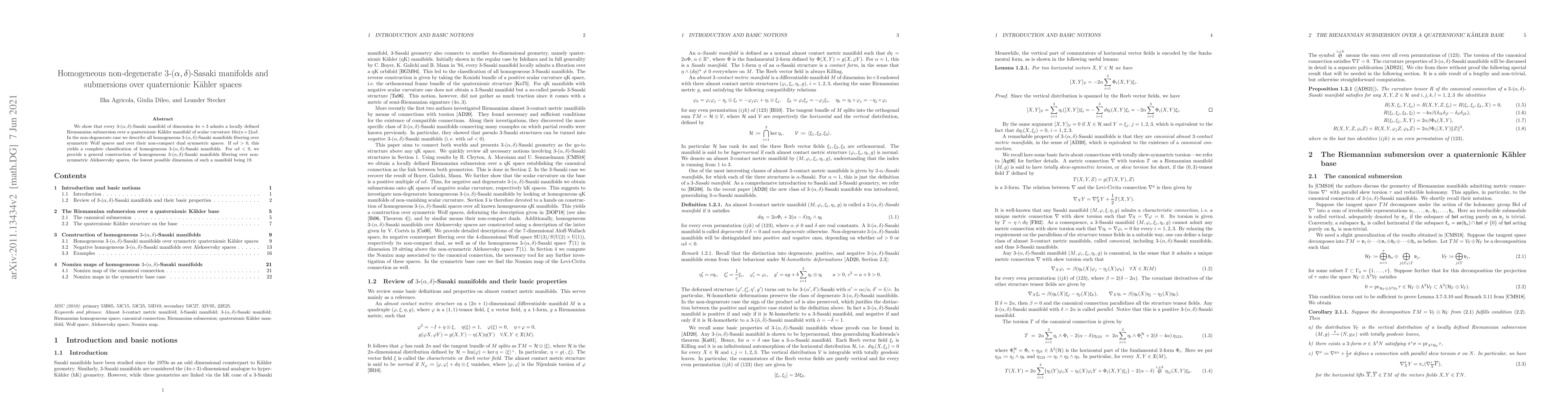 This paper establishes that $3$-$(\alpha,\delta)$-Sasaki manifolds admit Riemannian submersions over quaternionic Kähler spaces, with a focus on classifying homogeneous non-degenerate cases. It provides a complete classification for $\alpha\delta>0$ and a construction for $\alpha\delta<0$.