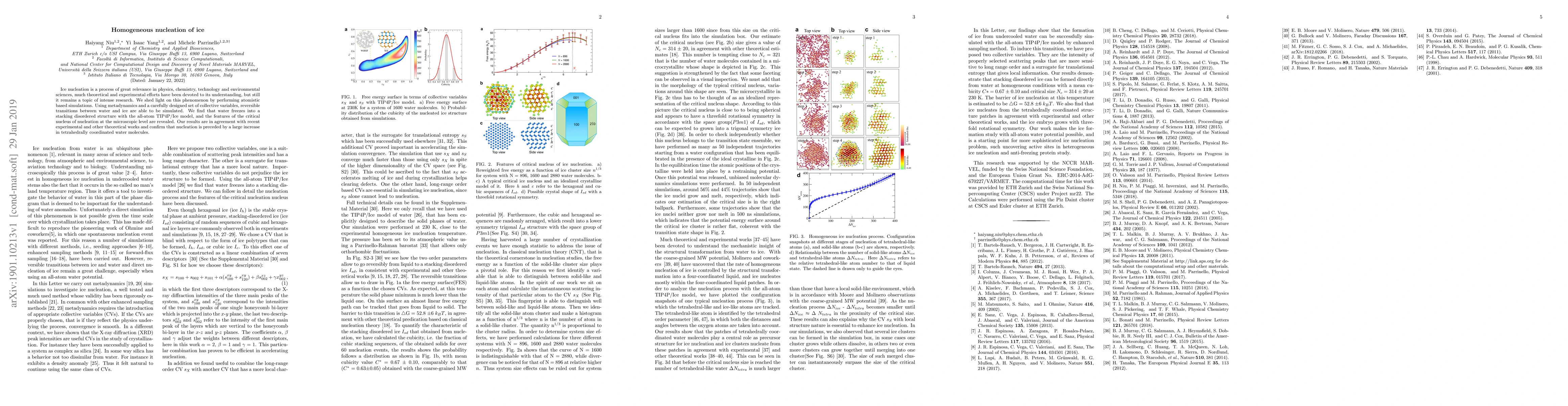 This paper uses atomistic simulations to study the homogeneous nucleation of ice, revealing that water freezes into a stacking disordered structure. The findings confirm that nucleation is preceded by a significant increase in tetrahedrally coordinated water molecules, aligning with recent experimental and theoretical studies.