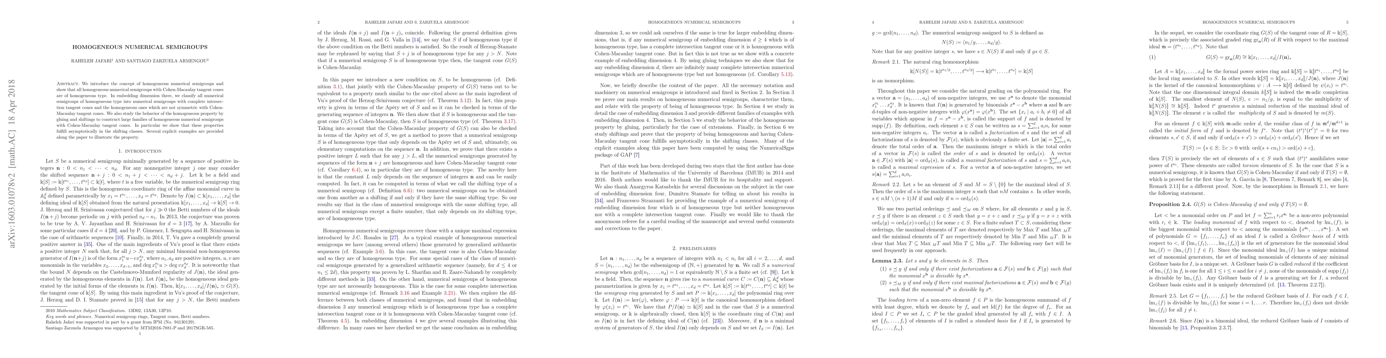 This paper introduces homogeneous numerical semigroups and demonstrates that those with Cohen-Macaulay tangent cones are of homogeneous type. It classifies numerical semigroups in embedding dimension three into complete intersection and homogeneous types, and explores the construction of a large family of homogeneous numerical semigroups through gluing and shiftings, showing asymptotic fulfillment of these properties.