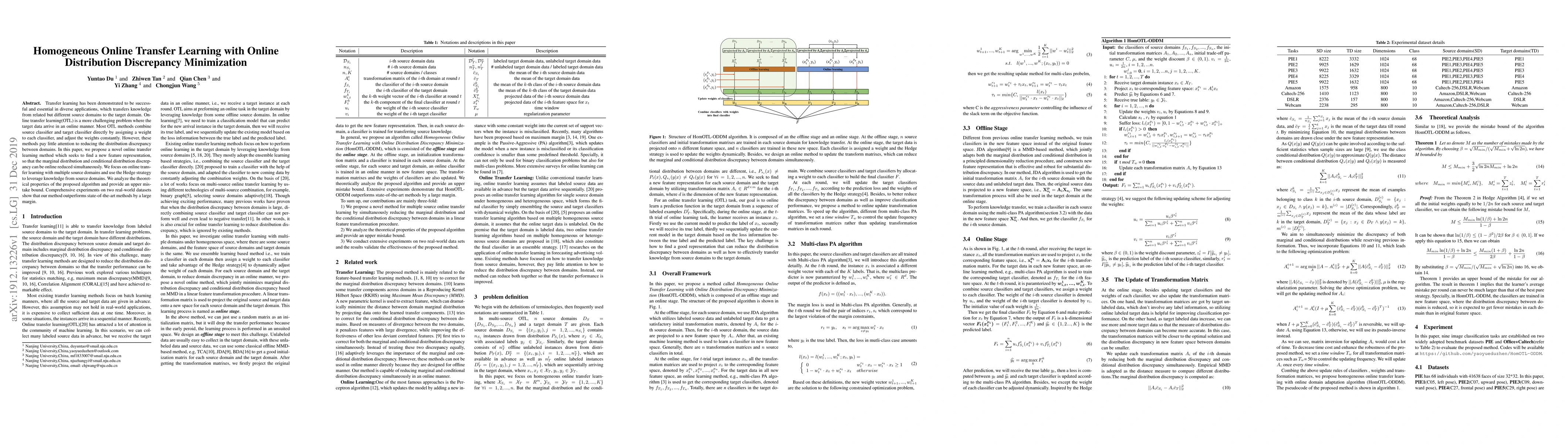 Transfer learning has been demonstrated to be successful and essential in diverse applications, which transfers knowledge from related but different source domains to the target domain. Online transfer learning(OTL) is a more challenging problem where the target data arrive in an online manner. Most OTL methods combine source classifier and target classifier directly by assigning a weight to each classifier, and adjust the weights constantly. However, these methods pay little attention to reducing the distribution discrepancy between domains. In this paper, we propose a novel online transfer learning method which seeks to find a new feature representation, so that the marginal distribution and conditional distribution discrepancy can be online reduced simultaneously. We focus on online transfer learning with multiple source domains and use the Hedge strategy to leverage knowledge from source domains. We analyze the theoretical properties of the proposed algorithm and provide an upper mistake bound. Comprehensive experiments on two real-world datasets show that our method outperforms state-of-the-art methods by a large margin.