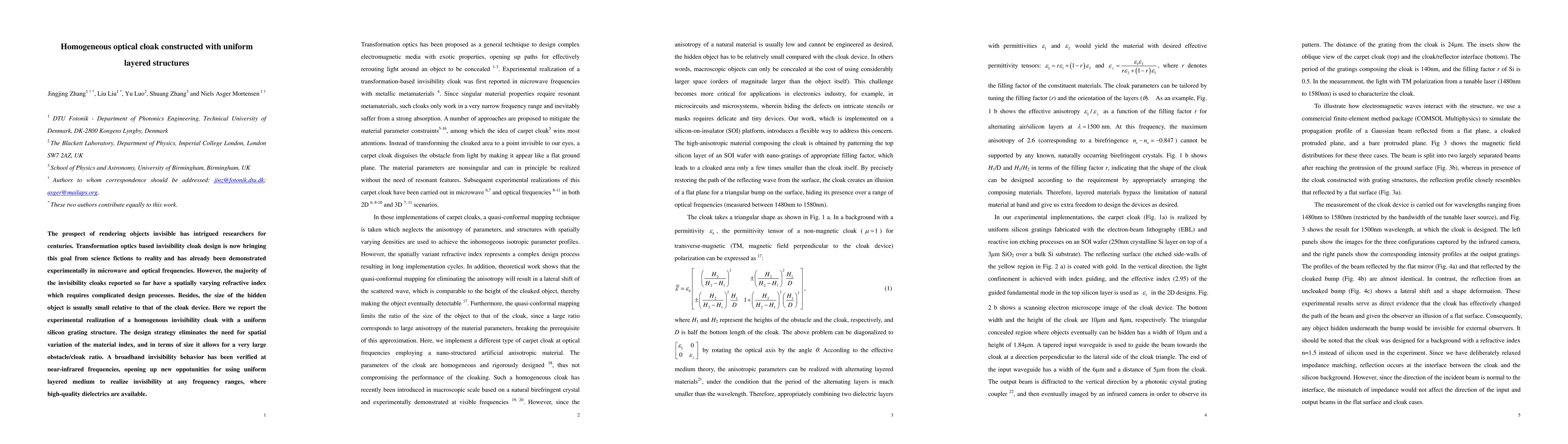 This paper reports the experimental realization of a homogeneous optical cloak using uniform silicon grating structures, eliminating the need for spatially varying refractive indices. This design allows for a large obstacle/cloak ratio and demonstrates broadband invisibility at near-infrared frequencies, suggesting potential for uniform layered media in achieving invisibility across various frequency ranges.