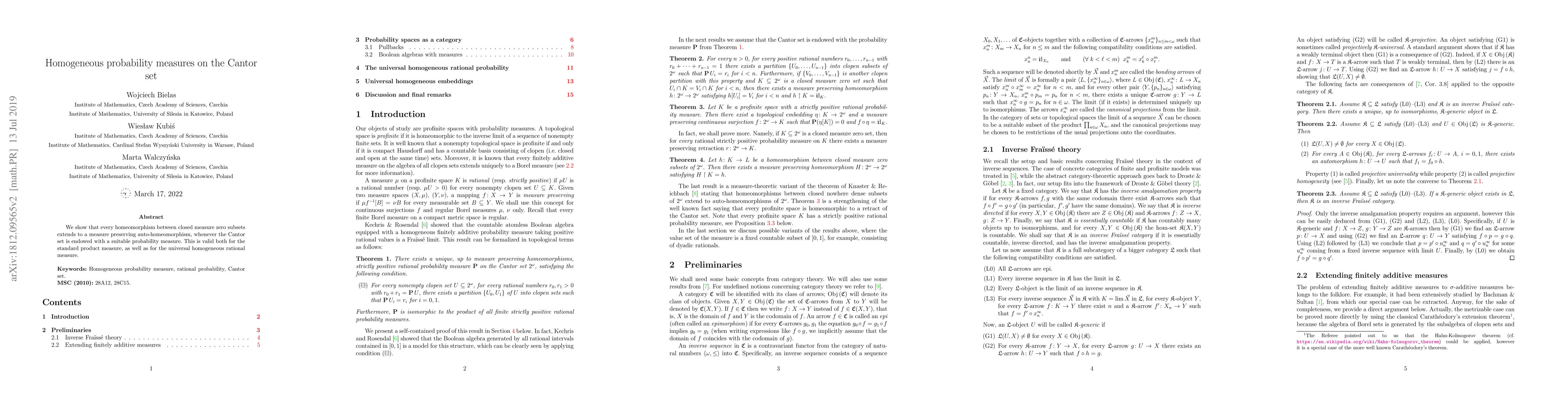 We show that every homeomorphism between closed measure zero subsets extends to a measure preserving auto-homeomorphism, whenever the Cantor set is endowed with a suitable probability measure. This is valid both for the standard product measure, as well as for the universal homogeneous rational measure.