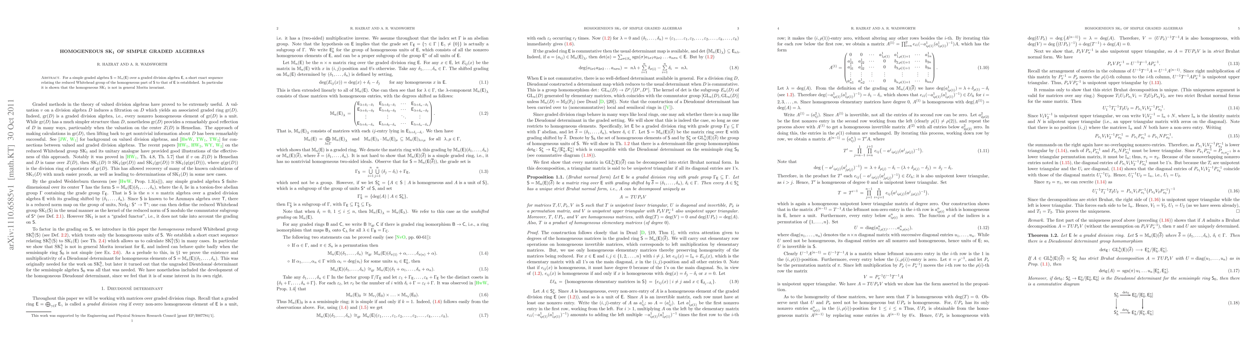 Summary: The paper establishes a short exact sequence connecting the reduced Whitehead group of a simple graded algebra A to that of its graded division algebra E, demonstrating that the homogeneous SK1 group is not universally Morita invariant.