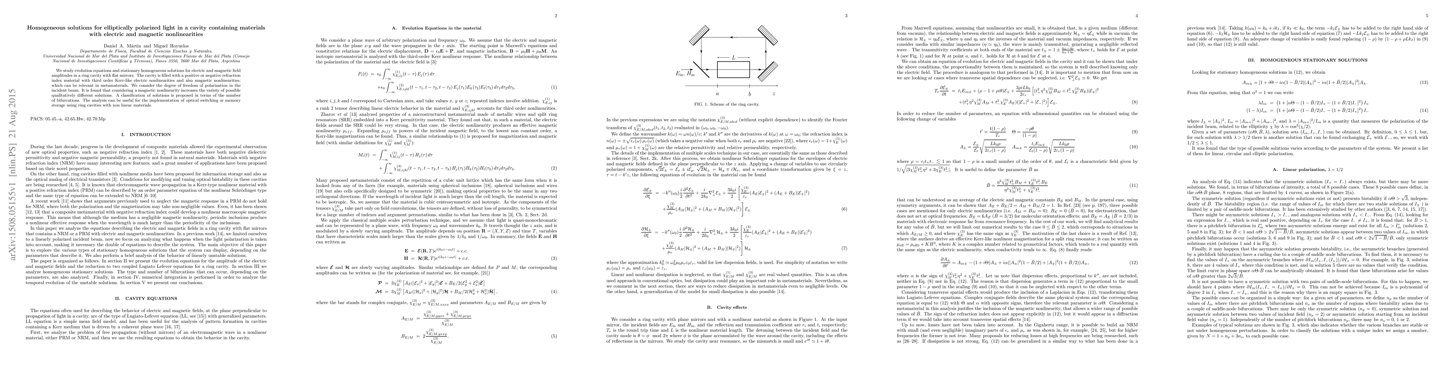 We study evolution equations and stationary homogeneous solutions for electric and magnetic field amplitudes in a ring cavity with flat mirrors. The cavity is filled with a positive or negative refraction index material with third order Kerr-like electric nonlinearities and also magnetic nonlinearities, which can be relevant in metamaterials. We consider the degree of freedom of polarization in the incident beam. It is found that considering a magnetic nonlinearity increases the variety of possible qualitatively different solutions. A classification of solutions is proposed in terms of the number of bifurcations. The analysis can be useful for the implementation of optical switching or memory storage using ring cavities with non linear materials.