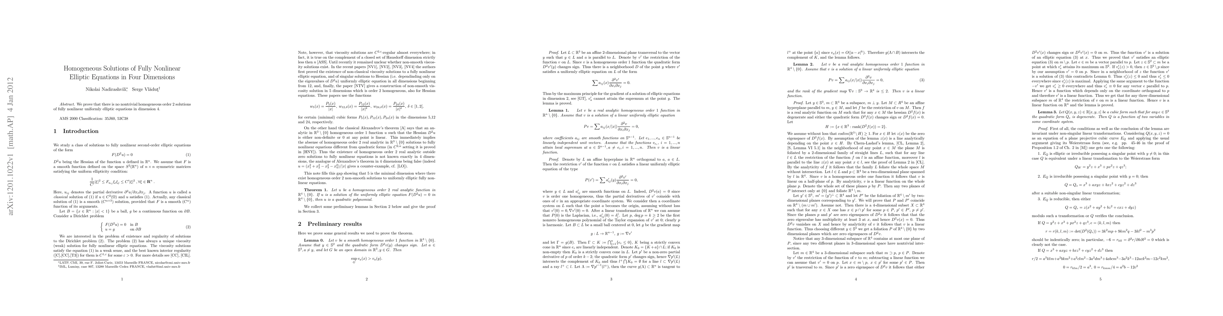 Summary: This paper demonstrates the absence of nontrivial homogeneous order 2 solutions for fully nonlinear uniformly elliptic equations in four dimensions. The result highlights a significant property of such equations in this specific dimensional context.