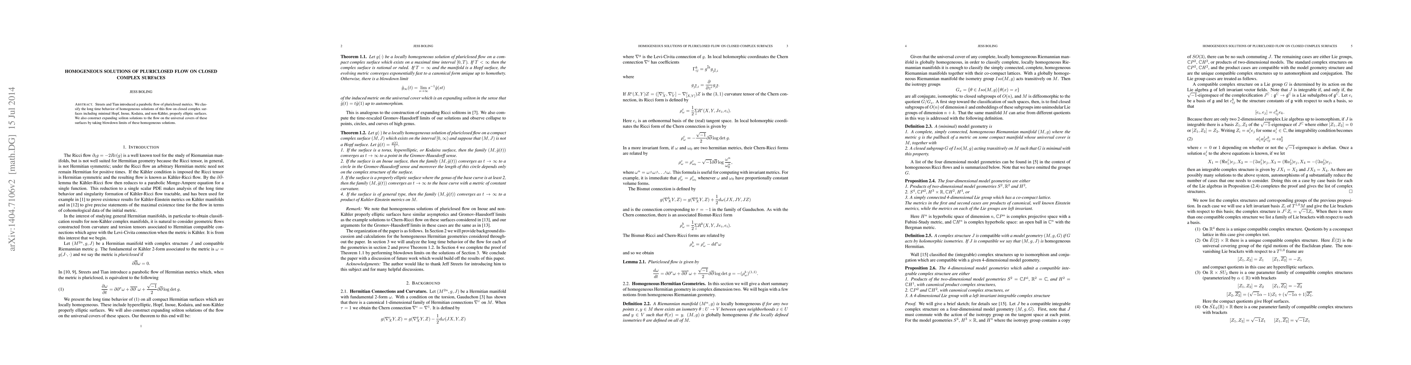 Streets and Tian introduced a parabolic flow of pluriclosed metrics. We classify the long time behavior of homogeneous solutions of this flow on closed complex surfaces including minimal Hopf, Inoue, Kodaira, and non-Kahler, properly elliptic surfaces. We also construct expanding soliton solutions to the flow on the universal covers of these surfaces by taking blowdown limits of these homogeneous solutions.