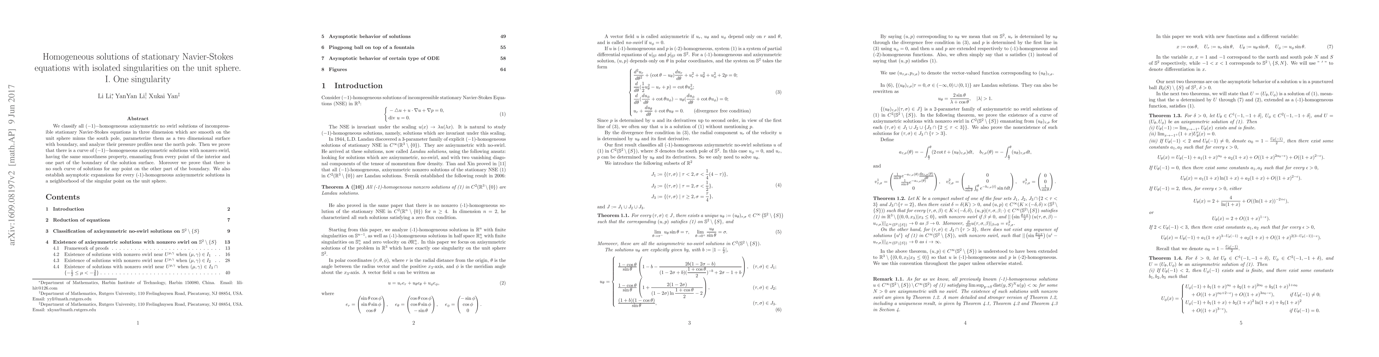 We classify all $(-1)-$homogeneous axisymmetric no swirl solutions of incompressible stationary Navier-Stokes equations in three dimension which are smooth on the unit sphere minus the south pole, parameterize them as a two dimensional surface with boundary, and analyze their pressure profiles near the north pole. Then we prove that there is a curve of $(-1)-$homogeneous axisymmetric solutions with nonzero swirl, having the same smoothness property, emanating from every point of the interior and one part of the boundary of the solution surface. Moreover we prove that there is no such curve of solutions for any point on the other part of the boundary. We also establish asymptotic expansions for every (-1)-homogeneous axisymmetric solutions in a neighborhood of the singular point on the unit sphere.