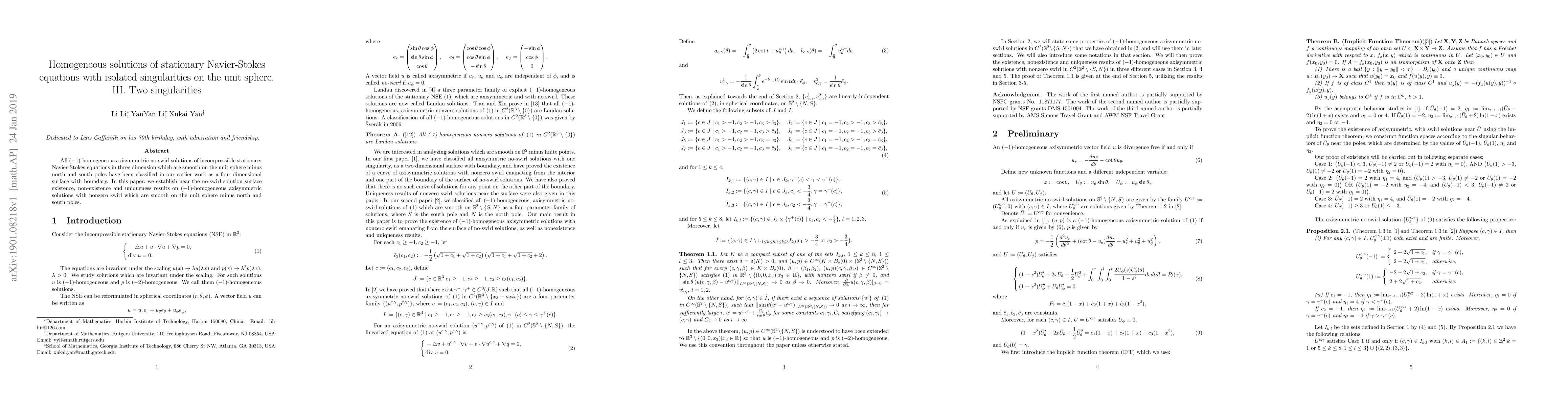 All $(-1)$-homogeneous axisymmetric no-swirl solutions of incompressible stationary Navier-Stokes equations in three dimension which are smooth on the unit sphere minus north and south poles have been classified in our earlier work as a four dimensional surface with boundary. In this paper, we establish near the no-swirl solution surface existence, non-existence and uniqueness results on $(-1)$-homogeneous axisymmetric solutions with nonzero swirl which are smooth on the unit sphere minus north and south poles.